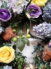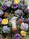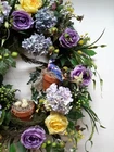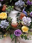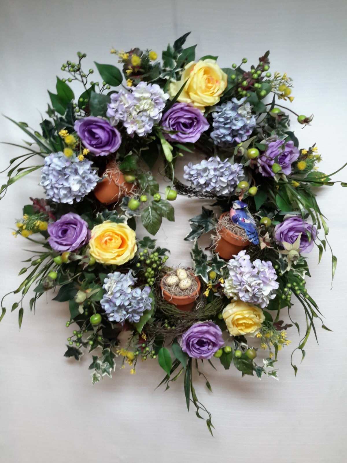 An elegant one of a kind wreath overflowing with Hydrangeas, beautiful purple and yellow Roses overflowing with wild grass, ivy and lots of foliage. Interwoven is a dried vine covered in moss creating a very unique artistic look. Three little pots with a nest and an adorable Blue Jay bird add whimsy to this truly one of a kind wreath. This wreath took me a long time to create and will add color and charm to any room in your home. Makes a beautiful thoughtful gift for any occasion. Perfect for Bridal Showers, Weddings, Baby Showers, Anniversaries .... A realistic flower decoration that lasts for years Wreath measures approximately 26" All my wreaths are handmade with love and special attention to every detail. Please contact me with any questions or concerns before buying. Costumer satisfaction is of great importance to me and positive feedback greatly appreciated! I cover the shipping cost and package myself. Check out my other listings! There's a wreath for any occasion, all are unique and one of a kind.