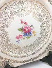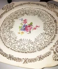 Vintage Set of 3 Square Salad Plates 22K Gold Ornate Details with roses and scrolls ~ Lovely filigree pattern that catches the light (see photos) Pink & multicolored floral bouquet in the center of each plate with cabbage roses Measure 6 1/2" diameter Unmarked ~ pattern name unknown although reminiscent in style of Limoges, Sebring, American Limoges in the 1930s...could be any of those but I'm not certain as they are not marked No chips or cracks. Minor crazing. Please see photos and zoom if for clarity. This is a beautiful set for display or replacement! Carefully packed and shipped by Daisy!