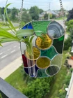 Enhance your living space with this stunning Stained Glass Tiffany Abstract Handmade Panel. Handcrafted in Canada, this large suncatcher features a vibrant multicolour design with intricate cuttings that create a beautiful abstract pattern. Made from high-quality stained glass, this suncatcher has a shiny finish that adds a touch of elegance to any room. Perfect for adding a pop of color and style to your home decor, this unique piece is sure to be a conversation starter.Ideal for those who appreciate handmade craftsmanship and unique home accessories, this suncatcher is a true work of art. Bring a touch of creativity and sophistication into your home with this one-of-a-kind stained glass piece, showcasing a blend of traditional Tiffany style with a modern twist. Perfect for hanging in a sunny window or as a decorative accent on any wall, this suncatcher will brighten up your space and infuse it with charm and personality. Measurements are approximate: W 5.5" x H 8.5". 14 cm x 22 cm. Chain. 15" 38 cm