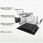 Innovative Auto-draining System: Our black dish drying rack has an extended lip on the drainboard directs water onto your sink to prevent pooling. In addition, adjustable drainage channel swivels 360° which is perfect for directing draining water directly into the sink. This provides you with several placement options to best fit your kitchen and sink environment Two Tier Extra Large Capacity: Free up 50% of the kitchen counter space and create a neat and clean kitchen, with a jumbo size - 15.9(L)*13(W)*11.6(H) inches. This highly-customizable dish rack comes with a range of changeable elements, including one dish drain boards, a microfiber mat, a utensil holder, 5 cup holder attachments as well as a cutting board attachment, you can store up to 11 individual plates in the rack, while the bottom tiered can accommodate bowls and pans Rustproof and Super Sturdy: The Dish Drainer made of heavy duty stainless steel with nano-coating finish, the 2 tier dish rack will resist any damage that causes rust or discolor - durable and easy to clean which made to last, this kitchen dish rack is a solid metal drying rack choice for every household, it passed a 24-hour salt test Easy to Install and Fully Adjustable: No screws and tools are needed, you just assemble them together, it's super easy and my child can do it too! All the attchments are detachable, you can install them according to your need! Package includes 1 dish dryer rack,1 cutting-board holder, 1 wine glasses holder, 1 cups holder, 1 drainboard Set, 1 dish drying mat, 1 wide utensil holder Removable Top-Shelf Design: Our two tier dish drying rack and attachments can expand the countertop counter, so it holds more dishes than a regular dishrack. You can install the top layer in the plate drying rack or place it in sink or wherever you want, which convenience to fit the cabinet height