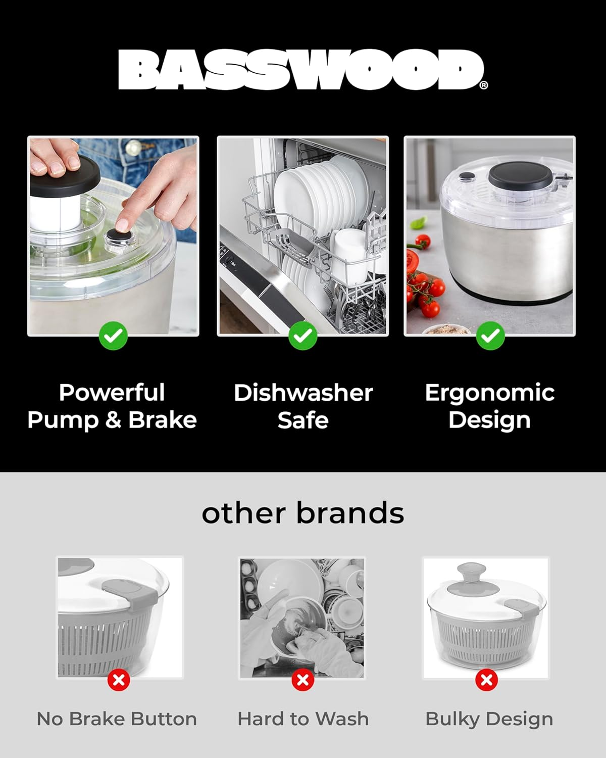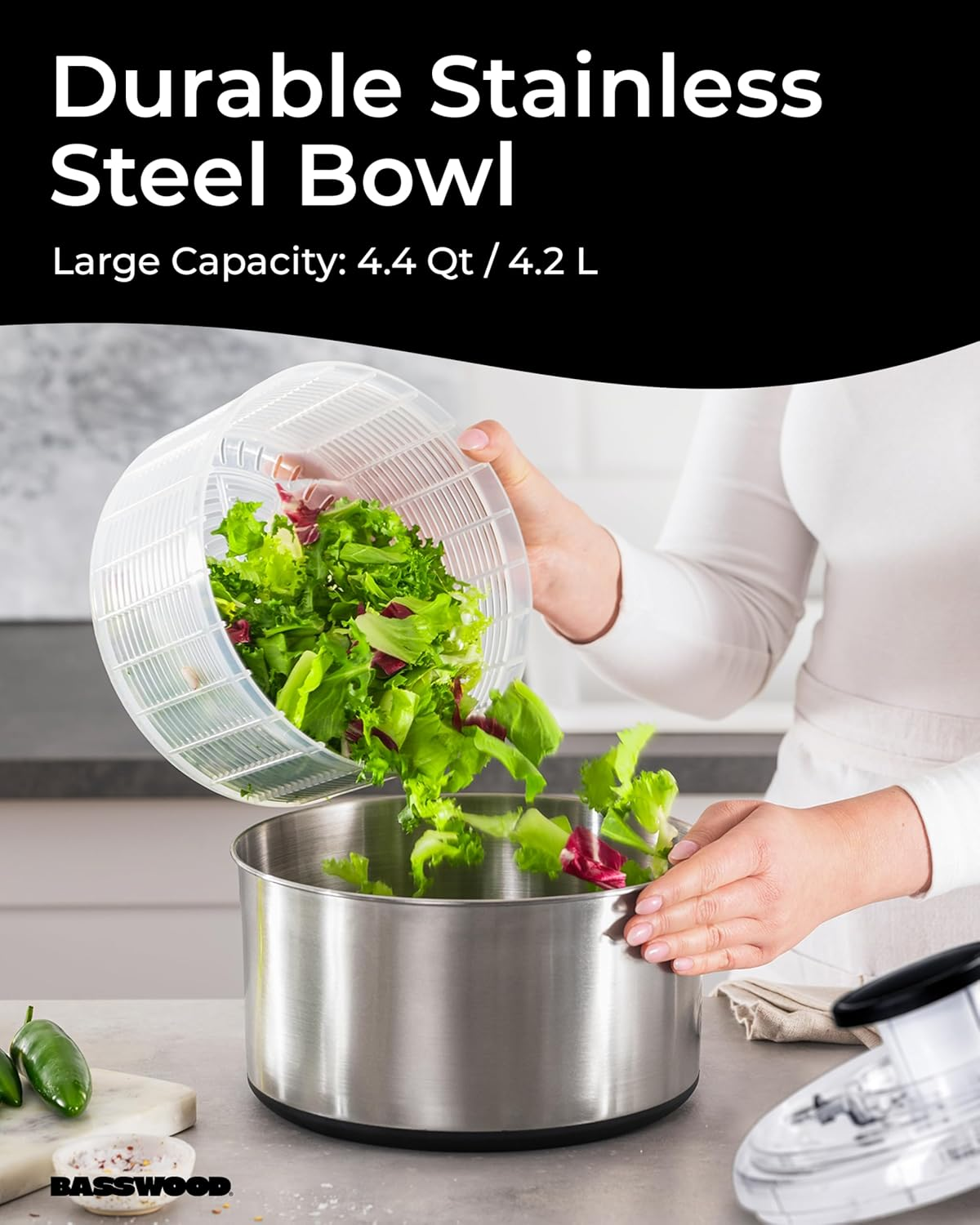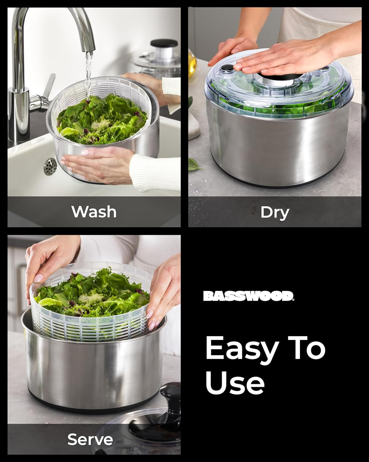 This salad spinner is a game-changer! The stainless steel bowl feels sturdy, and the pump mechanism works smoothly to dry greens fast. It’s compact yet holds a generous 4.7 quarts—perfect for washing veggies, fruits, or even draining pasta. The design is simple but effective, and cleanup is a breeze. No more soggy salads—just crisp, dry greens every time. Highly recommend for any kitchen!