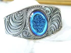 When it’s time to party, you need a fun bracelet, and this is it! This fabulous chunky sterling silver wrap cuff bracelet showcases a very slick design with an electric blue drusy crystal and beadwork that is meticulously placed. The gap opens to accommodate a size up or down. WEIGHT: 33.6 grams - nice weight MEASURES APPROX: 7.5" inside or 2- 1/2" across the top x 1.32" top to bottom of the widest area MARKINGS: '925' for sterling silver and there might be a maker's mark under the retail sticker