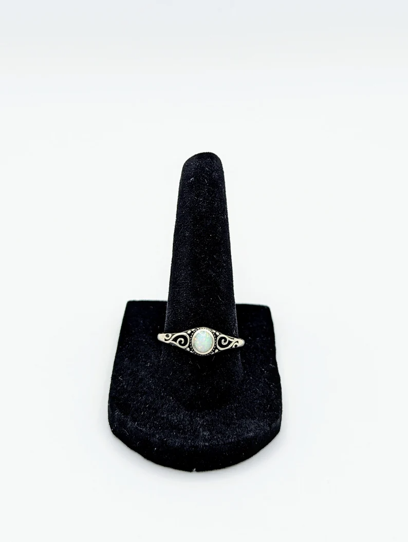 Introducing our Swirls Opal Sterling Silver Ring. This ring can be worn as a midi, a stackable, a promise ring, or by itself as a statement ring. Crafted from high quality .925 sterling silver. Gifting: Looking for the perfect gift for the special women in your life? Explore our stunning collection of rings for women, including beautiful stackable rings that make ideal gifts for Mother's Day, birthdays, anniversaries, and Christmas. Whether you're celebrating a milestone or simply showing appreciation, our handpicked selection offers something for every occasion. Discover the joy of giving with our exquisite range of rings, guaranteed to make any birthday or anniversary unforgettable. Care: Ensure your sterling silver jewelry maintains its stunning shine with proper care. To keep your pieces looking their best, gently polish them with a soft cloth regularly to remove any tarnish. Avoid exposing sterling silver to harsh chemicals, such as chlorine or household cleaners, which can cause damage. When not wearing your jewelry, store it in a cool, dry place away from sunlight to prevent tarnishing. With a little care and attention, your sterling silver pieces will continue to sparkle for years to come.