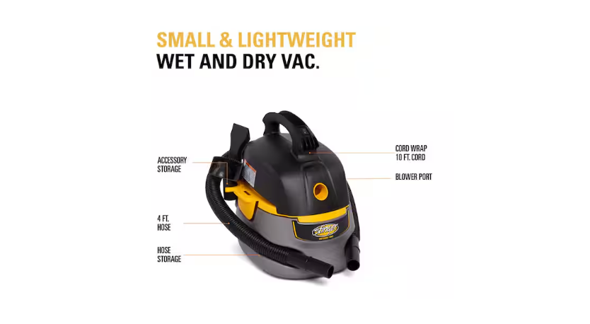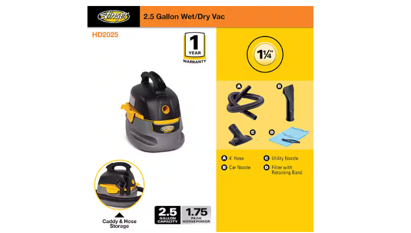 About This Product The Stinger 2.5 Gal. 1.75 Peak Horsepower Wet Dry Shop Vacuum is a compact and portable vac for wet and dry applications. Expect the suction to be just what you need for your home, garage and renovation cleanups. The easy-to-carry design with large handle is portable and can conveniently be stowed into smaller storage spaces. The vacuum also doubles as a blower to clear dirt, debris and leaves away from certain areas. Included shop vacuum attachments allow you to take on a wide variety of surfaces and applications that would be harder to clean with the hose alone. For specialized cleaning, use the utility nozzle attachment for larger pickups and the car nozzle for detailed cleaning of upholstery and carpet - all can be stored onboard the wet dry vacuum. The 4 ft. hose quickly stores on vac and the filter bag traps dust and debris. To install the filter bag, place filter on top of filter cage and slide the elastic retaining band over it to securely fasten it. Change the wet dry vacuum filter often for optimal vacuum performance. Uses replacement vacuum filter bag VF2000 (sold separately). Highlights Stinger 2.5 gallon 1.75 peak horsepower Wet/Dry Vacuum includes hose, filter bag, utility nozzle and car nozzle 1.75 peak horsepower, 4.5 amp motor and dent-resistant, durable plastic tank is the solution for any home, garage, or renovation mess Vacuum easily converts into a blower to help clear work areas of debris Included bag filter traps dust and debris 10 ft. power cord provides reach and stores easily using the cord wrap on top of the vac Built-in storage stows the 4-ft. hose, car nozzle and utility nozzle Vacuum utility nozzle helps pick up a variety of messes and the car nozzle is ideal for detailed cleaning of upholstery and carpet Peak horsepower represents a level at or below the maximum horsepower output of an electric motor tested in a laboratory using a dynamometer Gallons indicated reflect drum volume, not collection capacity Shop Compatible Accessories for your Shop Vacuum Click here for more information on Electronic Recycling Programs Return Policy Product Information Internet # 308699706 Model # HD2025 Store SKU # 1004403661 Store SO SKU # 1004121896