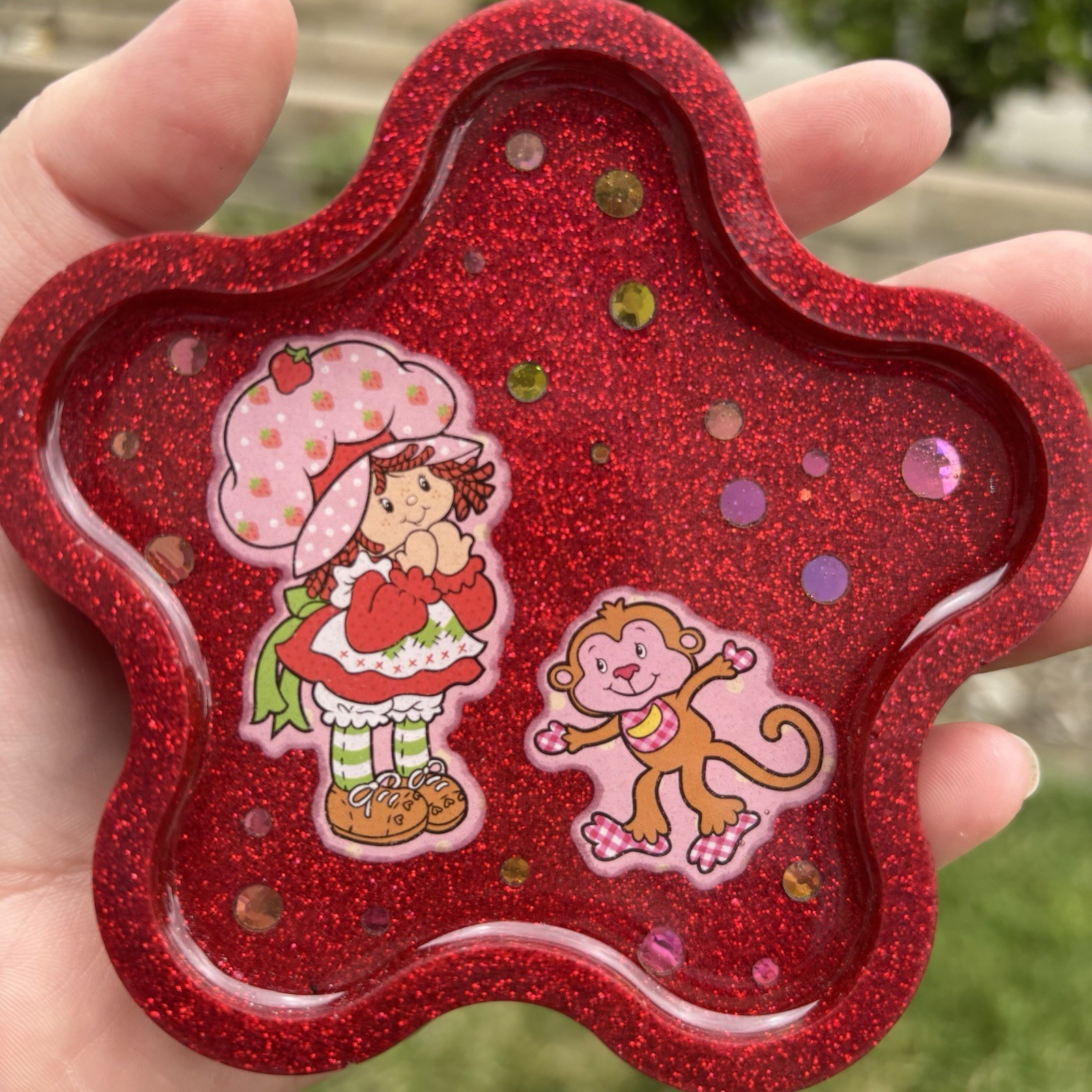 ‘Strawberry Disco’ Strawberry Shortcake Inspired Rhubarb Monkey and Reflective Dotted Red Sparkly Flower Shaped Resin Coaster Handmade by Shop EarthySmurf. *Please note, resin is an imperfect art. Craters, holes, sharp edges, bubbles and more may be present in your piece. Please examine all pictures*