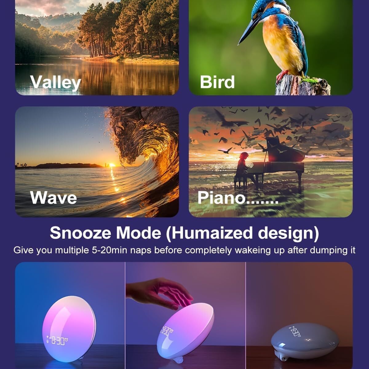 【Wake Up Sunrise Alarm Light】Combines sunrise alarm, smart ambient light, sound simulator, sleep assistant and other functions in one. Has 18 different dynamic lighting effects, 16 million colors and 16 soothing natural sounds, gently waking you up every morning and helping you fall asleep every night. 【Sleep Aid White Noise Sound Machine】Still troubled by insomnia? The gradual sunset simulation and natural white noise make it easy for you to fall asleep. Under the soft and gentle light, listen to the cicadas and campfire, or the stream flowing in the forest, and fall asleep. The sleep time can be set at will, and the sound and light will gradually weaken and stop automatically when the time is reached. 【Dual Alarm and Snooze Function】Two alarms can be set at the same time, one for weekdays and one for weekends. In addition, the snooze function allows you to sleep a few more minutes with the click of a button to avoid staying up all night. 【Great for Kids & Voice Controlled Light】In addition to meeting the needs of adults, the baby sound machine accompanies the healthy growth of your child, providing soft light for midnight newborn feedings, a cozy night light for preschoolers, and timer settings for your older child! The kids alarm clock features one-touch control, and the kids alarm clock can be adjusted remotely via the phone. No need to disturb a sleeping baby! 【Light Therapy & Bio-Benefits】Sleep Sound Digital Clock, Inspired by Nature, Designed by Optometrists. Wake up light therapy lamp will help you balance your circadian rhythms. Happy lights have been shown to boost energy and productivity for the rest of the day. UV-free LED lamps emit 10,000 lux of brightness, bringing 6500K light to help you stay energized and focused.
