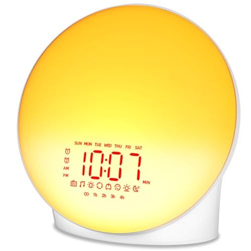 This sunrise alarm clock is a game-changer! The gentle light simulation wakes me up naturally, and the dual alarms are perfect for my partner and me. Love the variety of soothing sounds and FM radio option—no more jarring beeps! The compact design fits nicely on my nightstand, and the customizable settings make it easy to adjust for weekdays vs. weekends. Fast shipping and great seller too!