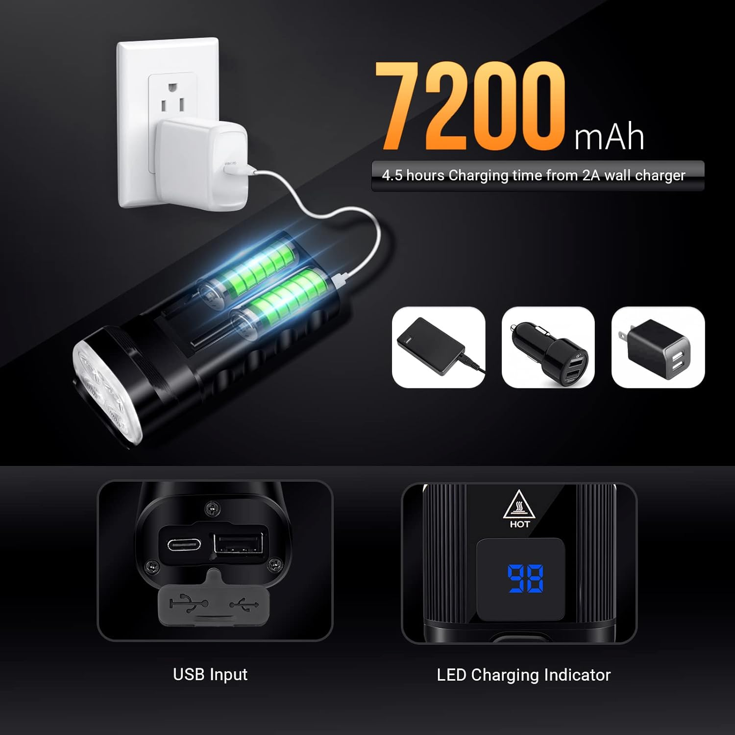 【Super Bright】The bicycle light is very bright with the maximum output is 2000 lumens, and the four LED lights cover a wide range up to 656ft/200m, it allows you to ride at night to see wider and further areas, also makes your night riding safer. 【13 Lighting Modes】The bike headlight has 13 adjustable light modes, free to switch according to your needs. Suitable for various scenes, such as cycling, camping, night fishing, caving, hunting and more. 【Intelligent LED Display】 Our bicycle front light is equipped with an LED digital display, it can show you the battery left in digital format so that you can know when the power is fully charged and how long the battery available. 【IP65 Waterproof】 This bicycle lights with IPX65 waterproof, it will bring you visibility lights for extra safety work in bad weather, also protect it against splashing water from any angle. Furthermore, with aircraft-grade aluminum alloy casing makes it durable and strong. 【USB Rechargeable】Built-in 7200mAh rechargeable battery for bike front light. You can charge it via any USB charging port with 2A output, also you can use it as a power bank to charge your smart phone, which is very important in outdoor emergency situations. Product Description BETTER LIGHT & BETTER LIFE Ultra Bright 4 LED bicycle lights meet your perfect expectations for the brightness of bicycle lights. With this bike light set, it will brighten your path and keep you safe. Suitable for Different Bikes Universal size to fit all kinds of bikes: Mountain Bikes, Road Bikes, City Bikes or any Bike including Kids bikes. Note Make sure it dry before charging to keep safe. Please do not leave it in heavy rain for a long time. Do not look at or shine this lamp directly into eyes. Headlight Specifications Lamp Beads: XPG-3 Waterproof: IP65 Visible Range: 656ft/200m Range Angle: 160° Light Mode: 13 modes Material: aluminum alloy Running Time: 16h max. Battery Capacity: 7200mAh USB Rechargeable The bike front light can be charged directly with any USB charging port with 2A output, such as mobile phone USB charger, power bank USB port and laptop USB. IP65 Water Resistant No need to worry when water splashed on the led lights especially in rainy or snow weather, as our bike front headlight has IPX65 waterproof performance. Used as a Flashlight This 2000 lumen bike headlight can be used as a flashlight. Keep you safe when outside Hand grip design is portable GoPro Mount We equip a GoPro mount with the light in order to make you more convenient Package Contents 1 X Bike Headlight 1 x 360° Degree Rotation Holder 1 x Type-C Charging Cable 1 X GoPro Mount Versatile Use Not only a bike light, also can be used as an emergency flashlight, torch, helmet headlight. Suitable for cycling, camping, walking, or other nighttime work. 13 models for you
