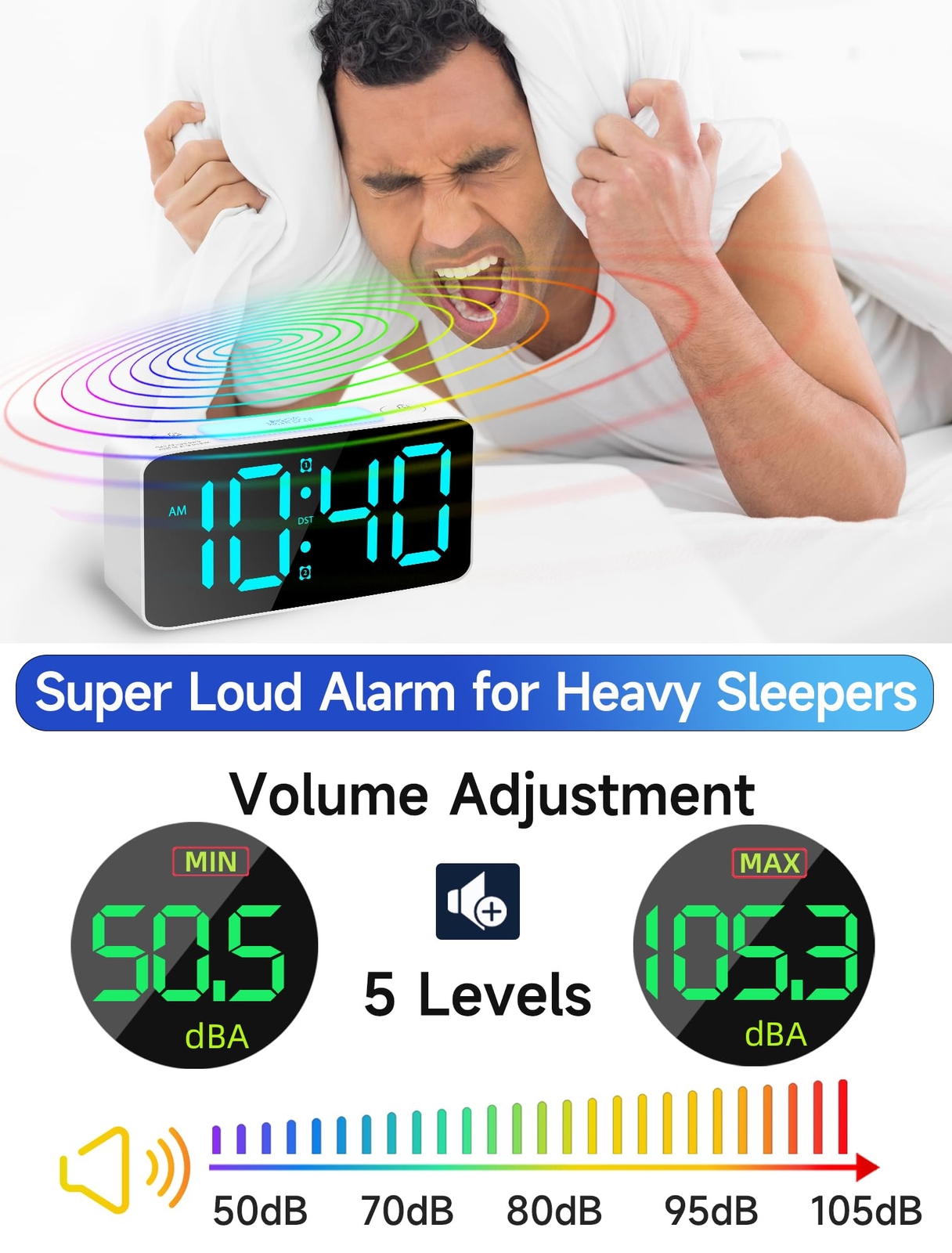 Super Loud Alarm Clock for Heavy Sleepers Adults,Digital Clock with 7 Color Extra Loud Alarm: Featuring a max volume of 105dB with 5 adjustable levels, dual alarm is suitable for heavy sleepers and adults Dynamic RGB Display: This cool desk clock features 15 different RGB colors and 4 brightness levels, Great gift for teenagers Colorful Night Light: 7 different color options for a vibrant ambiance, teen gifts for boys and girls Larger Numbers: 6.3" LED digital display with large 2.1" tall numbers for easy readability from a distance Regular Features: Includes 9-minute snooze time, 12/24 hour time format, Daylight Saving Time, and dual DC 5V/1A USB output ports for convenient device charging Outlet Powered And Battery Backup: Powered by an outlet and equipped with 3 AAA battery backup (not included), this simple rainbow clock is reliable and ensures that your time is preserved even during power outages Product size: 6.5*1.7*3 inches. Powered By: USB Power adapter (included) Shipping We offer FREE shipping on all orders! We ship within Three business days of payment, usually sooner. We use a selection of shipping services such as UPS, FedEx, USPS etc. We only ship to the lower 48 states, no APO/FPO addresses or PO Boxes allowed. Local pickups and combined shipping options are not provided at this time. Return You can return a product for up to 30 days from the date you purchased it. Any product you return must be in the same condition you received it and in the original packaging. Please keep the receipt. Payment We accept payment by any of the following methods: PayPal Please pay as soon as possible after winning an auction, as that will allow us to post your item to you sooner! Feedback Customer satisfaction is very important to us. If you have any problem with your order, please contact us and we will do our best to make you satisfied. Contact Us If you have any queries, please contact us via ebay. We usually respond within 24 hours on weekdays. Please visit our eBay store to check out other items for sale! Thank you for shopping at our store.