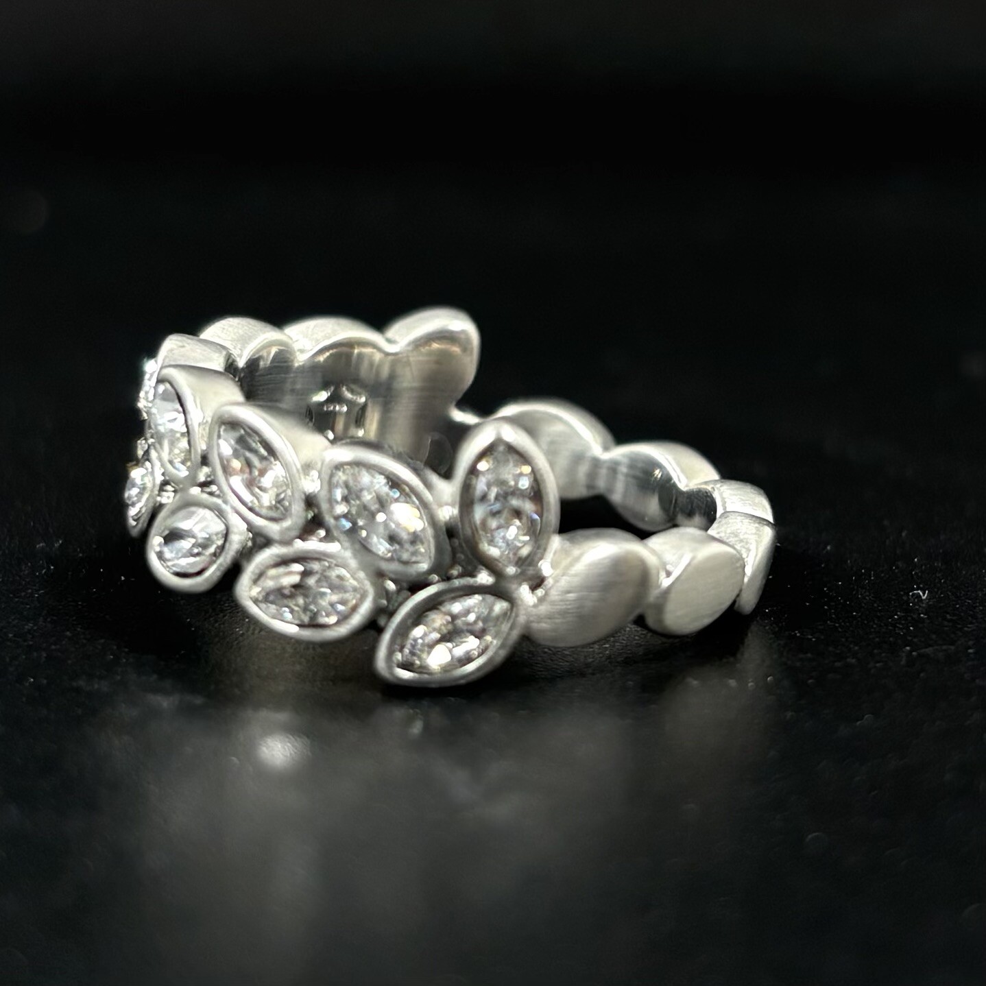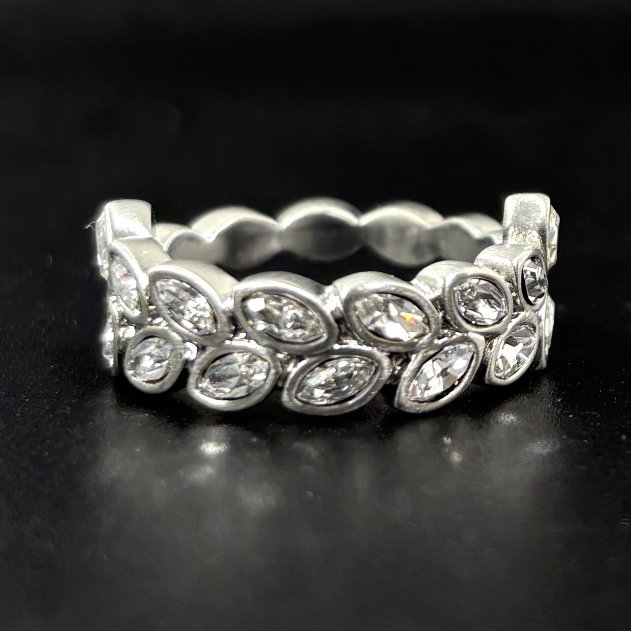 Touchstone Swarovski Olympia Crystal Ring Sz 7 Cocktail Leaf Brushed Silver Tone Great condition! The brushed silver tone finish is intact and bright, and the crystals are clean and sparkly. This ring definitely makes a statement! Please see pictures for details and message me with any questions.