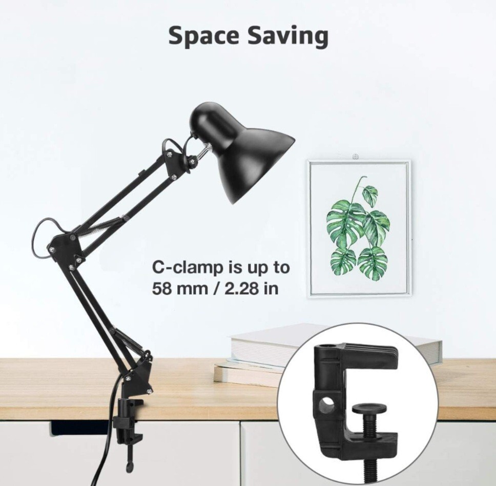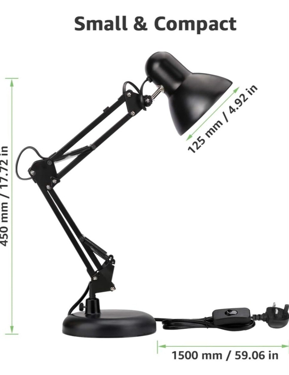 Lepro Desk Lamp, E27 Swing Arm Desk Lamp with Clamp, Classic Black Table Lamp, E27 Bulb Holder, Flexible Black Desk Light for Study Desk, Office, Bedroom, Reading, Nails, Back to School and More Finish type Painted Base material Metal Bulb base E27 Product dimensions 12.5D x 15W x 45H centimetres Item weight 1400 Grams Lamp type Desk Lamp Adjustable & Stable: This Lepro desk lamp has a spring-balanced swing arm for easy adjustment, allowing you to direct the light where you need it. Space Saving: The E27 table lamp can either stand on the desktop or be clamped on the edge of table to leave you a much cleaner space. Bulb Replaceable: The desk lamp uses an E27 screw bulb (sold separately) and supports both LED and incandescent bulbs with wattage limits of 15W for LED and 25W for incandescent. Classical Design: Featuring clean and simple lines, this desk light adds a touch of elegance to any desk or nightstand. It is equipped with a simple on/off switch for easy operation. What You Will Get: The package includes the Lepro swing arm desk lamp, a CE certified power adapter, and a user manual.