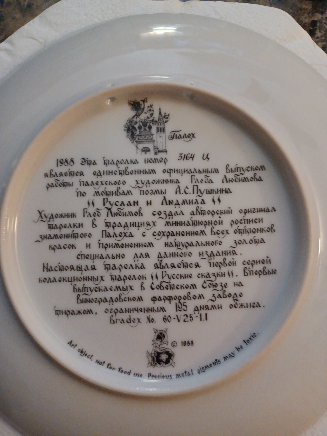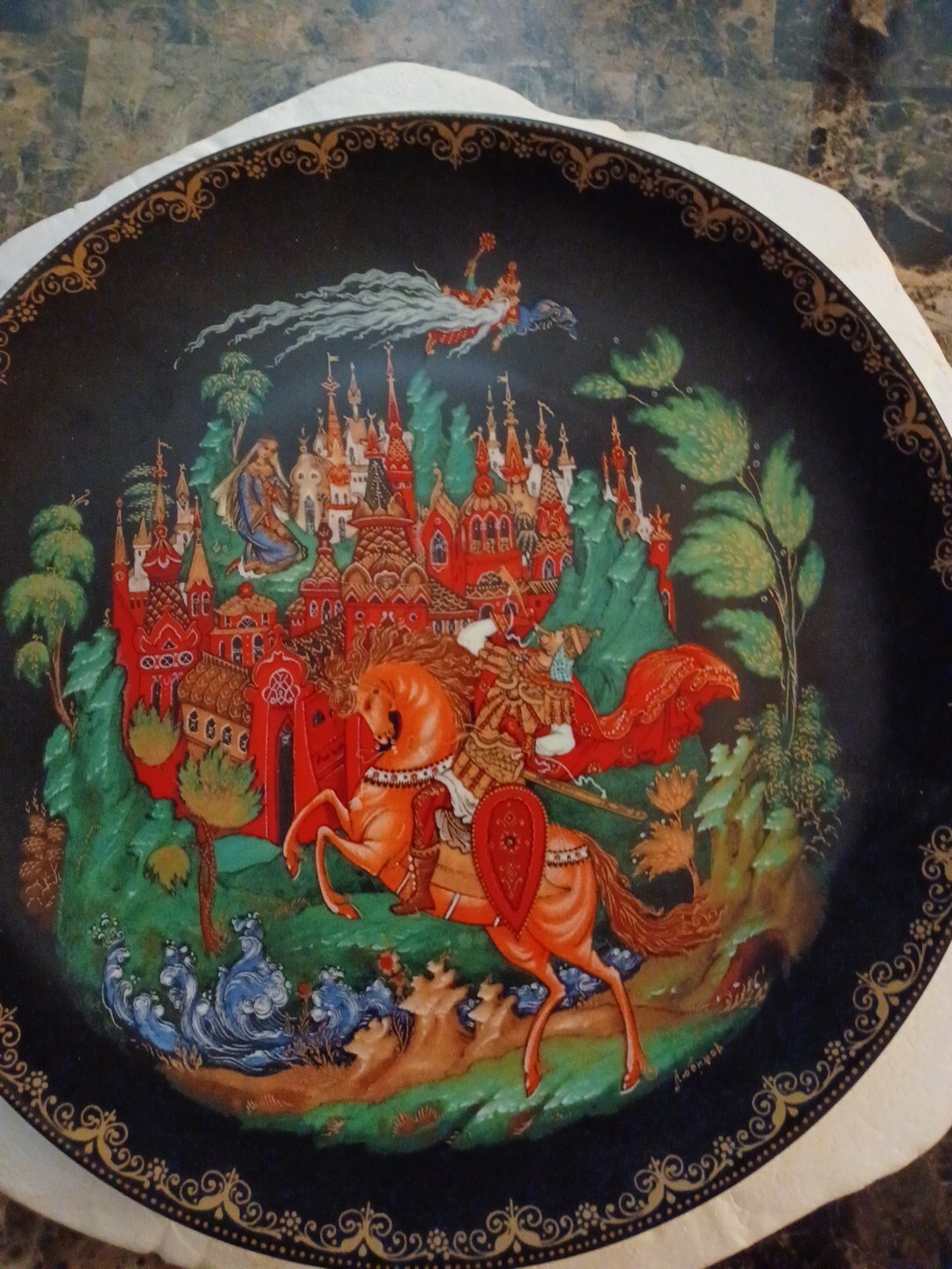 The product is a Tianex Russian decorative plate from 1988 featuring a fairy tale painting. The plate has a diameter of 8 inches and is adorned with vivid colors, making it a visually striking piece. Its decorative style and Russian cultural influence add to its aesthetic appeal, making it a desirable collector's item. Perfect for display, this collector plate would be a charming addition to any collection or a unique decor piece for those who appreciate Russian artistry.
