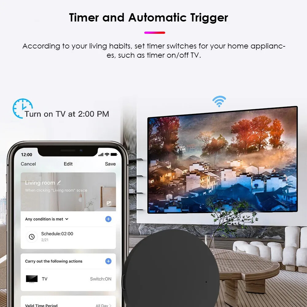 TUYA Smart WiFi IR Remote Control Universal Infrared DIY Smart Home Control For TV DVD AUD AC Works With Alexa Google Assistant Description: With this Universal IR Remote Control, you may use your smart phone to control home appliances, such as STB(Set-Top-Box), TV Box, TV, Air Conditioner, Fan, DVD, etc. Compatible with most of brands, for details, please refer to the supported brand list in App. Besides, it has LEARNING FUNCTON, allows you to copy the key function of original remote control to App. Note: Not compatible with the home appliances which use RF or BLUETOOTH remote control. 【1.Massive IR Code Database】 Support 4000 brands, 50000 IR Code on cloud, supported devices library is constantly being updated by the cloud. 【2. App Remote Control】 Remote Control your home appliances by using “Tuya Smart” App in your smart phone anywhere anytime. For example: Switch on home A/C in advance, enjoying the comfortable temperature once you get home. 【3. Easy to install and add to app】 Once you plug the cable line into the device, the device starts to start, and then select the app's "auto scan" function to find device. The whole process takes only a few minutes. 【4. Voice Control】 By connecting Intelligent speaker, such as Amazon Alexa, Google Home, you are able to control your home appliances by voice. For example: Alexa, turn on TV; OK Google, set air conditioning temperature to 25 degrees. 【5. Scenario and Automation in App】 A scenario consists of 1 or more actions. By creating an “Scenario”, you may control multiple devices with one tap; By adding an “Automation” and interworking with other smart home devices, Wi-Fi remote control is able to execute actions automatically according to conditions, such as device status, weather and time. 【6. Timer and Automatic Trigger】 According to your living habits, set time switches for your home appliances, such as turning on/off the air conditioner at regular intervals. 【7. DIY】 Customizing buttons in the Tuya Smart App if your home appliances brand is not in the list or not supported. 【8. Third-Party Control】 Works with Amazon Alexa, Google Assistant, Siri(iOS 12.0 or later), Tmall Genie, Tecent Xiaowei, DingDong, Rokid, DuerOS, etc. Specifications: Power input: DC 5V/1A Standby power consumption: <0.5W Working temperature: 0~50℃ (32~122℉ Working humidity: <85% RH Infrared frequency: 38K Infrared distance: <8m (affected by the environment) Connection method: 2.4GHz 802.11b/g/n Package Included: 1*Universal Remote Control 1*USB cable 1*Instruction