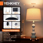 Table Lamp, 26" Lamps for Bedrooms Set of 2 3-Way Dimmable Touch Control Nightstand Lamp with USB A&USB C Charging Ports for Living Room, Bedroom, Workbench (2 LED Bulbs Included) Product Details Color: White Brand: YEHKHEY MPN: 0013 UPC: Does not apply EAN: Does not apply Finish Type: Multiple Base Material: Metal Bulb Base: E26 Product Dimensions: 12.5"D x 5"W x 26"H Lamp Type: LED Product Dimensions : 12.5 x 5 x 26 inches; 9.11 Pounds Item model number : 0013 Date First Available : October 5, 2023 Manufacturer : YEHKHEY Country of Origin : China Customer Reviews: 4.2 4.2 out of 5 stars 42 ratings Finish Type: Multiple Base Material: Metal Bulb Base: E26 Product Dimensions: 12.5"D x 5"W x 26"H Lamp Type: LED Shade Color: Beige Shade Material: Linen Switch Type: Touch Style: farmhouse, rustic, indoor, home decor Brand: YEHKHEY Color: White Special Feature: Corded Light Source Type: LED Material: Resin Room Type: bedrooms Recommended Uses For Product: Reading Power Source: Corded Electric Shape: Round Number of Light Sources: 1 Connectivity Technology: USB Included Components: Bulb included Is Waterproof: False Mounting Type: Tabletop Wattage: 9 watts Number of Items: 2 Lighting Method: Uplight Control Method: Touch Indoor/Outdoor Usage: Indoor Specific Uses For Product: Indoor use only Water Resistance Level: Not Water Resistant Installation Type: Tabletop Voltage: 110 Volts Brightness: 800 Lumen Is Cordless?: No Manufacturer: YEHKHEY Item Weight: 9.09 pounds Country of Origin: China Item model number: 0013 Finish types: Multiple Maximum Compatible Wattage: 60 Watts Special Features: Corded Batteries Included?: No Batteries Required?: No Bulb Features: Dimmable Color Temperature: 3000 Kelvin Color Rendering Index (CRI): 80.00 Average Life: 50000 Hours Bulb Diameter: 2.75 Inches Bulb Length: 4.3 Inches Date First Available: October 5, 2023 Elegant Design: YEHKHEY farmhouse table lamp seamlessly blends the elegant design of a linen lampshade and resin lamp body, adding a touch of nature and warmth to your living space. Whether it's for work, reading, or relaxation, this bedside lamp provides a comfortable and gentle illumination. Adjustable Brightness: To meet your different lighting needs, our resin table lamp is equipped with a metal touch button, allowing you to easily switch between brightness modes. From a soft 30% to a bright 100%, as well as an intermediate 60%, this table lamp offers you multiple lighting options, ensuring you have the ideal illumination for various situations. Includes Charging Ports: This isn't just a table lamp; it's also a charging hub for your electronic devices. With USB-C and USB-A output charging ports, supporting a maximum output of 10W, you can conveniently charge your smartphone, tablet, and other devices, even when the lamp is not in use. Solid Base: We've designed the base of our large table lamp with non-slip pads, providing additional stability and minimizing the risk of tipping over. You can confidently use it on your desk, bedside table, or anywhere else. Includes LED Bulbs: To ensure you enjoy immediate clear and bright lighting, the nightstand lamp comes with 2 adjustable 9W E26 LED bulbs(Each table lamp comes with a light bulb). These LED bulbs have a long lifespan, providing reliable illumination while reducing your electricity bill. Note: Maximum support for E26 bulbs with a wattage of 60W.