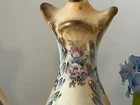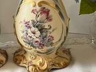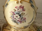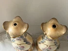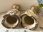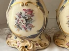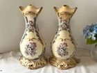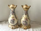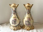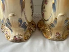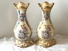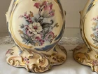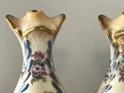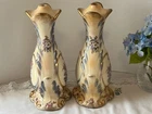 This is a pair of lamp bodies that could easily be restored to working lamps. They are beautiful with ornate white and pink floral designs with gold gilted trim as well as blue art nouveau style petaled framing of the patterns. No chips or breaks but there are some cosmetic issues which are shown in the pictures. There is no hardware or wiring and the bottom felt has been removed. On the inside bottom there is some squiggly lines on both which may or may not be a signed mark but could be just a random mark. These weigh almost 3 lbs a piece and have the holes for the cords. Not real sure of the time period but they do have an art nouveau shape to them. They measure about 12 1/2" Tall. Selling as is - please look at all pictures. *If needed, please ask for additional shipping quote.