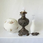 Vintage Table Lamp Features: Milk Glass Shade with Hand Painted Flowers Brass Middle Section with Cherubs Metal /Brass Pierced Base Frosted Chimney 25" tall x 10" Dia. Shade Very Good Vintage Condition VQF 5725 **************************************************** Looking for more great vintage Quality Finds then, please, visit our Ebay Store ! You will find a great selection of collectibles, re-purposed and unusual items that would be a great addition to your collection. Looking for the perfect or unusual gift, we may have it for you. Thank-you for your visit. ************************************************************************************** Shipping: We ship USPS Priority Mail, First Class and Media Mail, FedEx or UPS from Florida. We use eBay’s shipping calculator to determine shipping cost. Policies We describe items to the best of our ability. We are not experts. We know vintage, previously owned and loved items are not always perfect. We try to describe items as accurately as we can, list any flaws or defects that we can see. Most items listed are from estate sales so will do our best to take good pictures. We would never intentionally try to misrepresent an item or mislead a buyer. If we do make an error, PLEASE bring it to our attention, we always want people to be happy. Please review the listing and photo(s) carefully before bidding. Feel free to contact us with further questions.