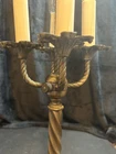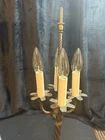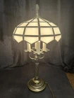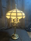 Vintage Table Lamp Tiffany Style Milk Glass Shade Art Deco Ornate Bronze Desk Lamp 23" Tall At the base of each light the drip guard is embossed in a leaf design. Take 4 candelabra base bulbs, not included Shade is 11 3/4" in diameter and base is 5 3/4" in diameter