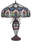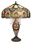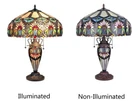 Victorian Stained Glass Tiffany Style Table Lamp with a lighted base. This Tiffany Style table lamp is a beautiful representation of the artist designs that have made Tiffany Lamps pieces of art. The artwork just captures your heart with the colorful artwork coming to life. The table lamp design is handmade with exceptional workmanship and maintains the brilliant color and shapes that we have come to expect from the Tiffany look. Lamp measures 24" Tall, base & shade with the shade measuring 18" in diameter. Lamp shade and base are made up with 786 pieces of hand cut copper-foiled cut glass & 96 Cabochon jewels Dark Antique Bronze Finish Base (2) 60 watt standard bulbs with p ull chains The base uses a 15 watt bulb with an on/off rotary switch on the cord. UL Approved The first photo shows what the light will look like when turned on. The second photo shows what the light will look like when taken out of the box. Your browser does not support JavaScript. To view this page, enable JavaScript if it is disabled or upgrade your browser.