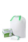 Bag size: 24” x 27” x 0.8 mil, white bag with green drawstring. These bulk pack garbage bags are scent free. They fit most of the 13gallon trash cans for daily kitchen and household needs. Packing: 200 pieces in a dispenser box. Just pull the bag out of the box and store the box wherever is convenient. Capacity: 13Gallon with maximum load of 40LBS We invite you to try tall kitchen drawstring trash bags. You will be glad at the quality product.