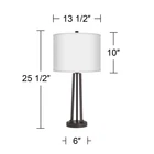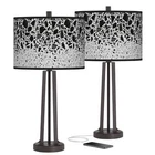 Shop Sale > Chandeliers Ceiling Lights Lamps Wall Lights Outdoor Lights Fountains Ceiling Fans Furniture Decor Terrazzo Susan Dark Bronze USB Table Lamps Set of 2 Style #91F15 PRODUCT DETAILS: 25 1/2" high overall. Shade is 13 1/2" wide x 10" high. Each lamp uses one maximum 150 watt standard-medium base bulb (not included). On-off switch located on the socket. Set of two contemporary modern table lamps from Giclee Glow. Dark bronze finish. Metal construction. Terrazzo giclee drum shade. Built-in 2A USB port located on the base. DESCRIPTION: Update a living room or bedroom area with this stylish pair of contemporary table lamps. Each lamp comes in a dark bronze finish metal frame, consisting of sleek slats that rise up from a round base, with space in between the slats to create an unusual geometric look. The lamp is then topped by a drum shade with a giclee printed Terrazzo pattern. A convenient USB port is built into the base, designed to charge smartphones and other devices. *Free Shipping applies only to orders shipping to the 48 continental United States that qualify and meet the minimum purchase requirement; standard shipping only and select products excluded, including freight and oversized items. Free Returns valid on select items in United States only; does not apply to freight, clearance, Daily Sale, designs with giclee art shades, Color Plus and Tiffany Color Plus brand items, or certain items with designer shades.