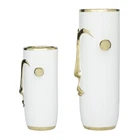 This vase is perfect for displaying orbs filler and twigs, as well as filling up any negative space against an open surface space. Create depth and form onto your space by displaying this beautifully crafted vase on you counter or table top. Create a lavish focal point vase piece on your living rooms and hallways as you style this set of tribal face vases with long-stem flowers and leaves. Designed with felt or rubber stoppers at the base that prevent scratching furniture and table tops, as well as sliding around. This item ships in 1 carton. Stoneware vase makes a great gift for any occasion. Suitable for indoor use only. This item ships fully assembled in piece. This white colored stoneware vase comes as a set of 2. Modern style. Vases have 5.75 in, and 4.95 in mouth openings. MODERN THEME Inspired by sleek elegance and clean lines, a minimalistic design offers effortless luxury with monochromatic tones and bold, angular structures MADE OF STONEWARE Product is made of pure stoneware for durable display WHITE AND GOLD POLISHED FINISH These ceramic face vases feature a high polished white and metallic gold finish FEATURES ROUND ABSTRACT VASE This white and gold flower vases showcase an abstract style tribal face with knob-shaped ear handles on the side and stylish metallic gold top and bottom rimmings 2 PIECES CONVINIENTLY SIZED Each white ceramic vase measures 7.95L x 6W x 15.60H , 6.95L x 5.10W x 10.90H inches, and collectively weighs 7.49 lbs