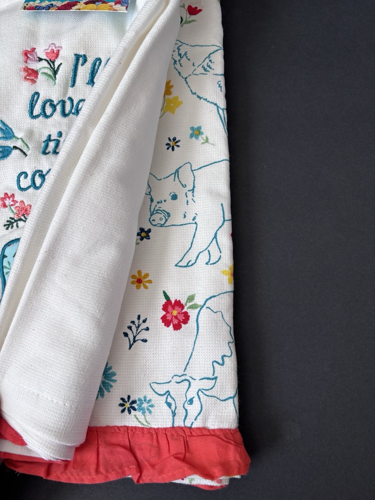 The Pioneer Woman 2pc 100% cotton kitchen towel set. Tea towel style in vibrant & rich colors turquoise, coral, yellow and green with a floral theme. In classic Pioneer Woman fashion there is a dainty ruffle on the front of each towel. There are also pretty flowers, a cow shape, and the phrase “I’ll love you till the cows come home embroidered on the front of one, and a cute farmhouse animal print all over the other. Each towel measures 30”L x20”W