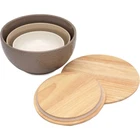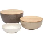 Versatile Ceramic Bowls with Wooden Lids Mixing, serving, storing . . . these ceramic bowls handle it all and with style, too! Prepare a variety of foods with three convenient sizes of bowls, then transport your delicious dishes with the two included wooden lids. They seal tightly to keep food fresh and presentable. The Thirstystone Bowl Set include 3 ceramic bowls (small, medium and large) and 2 wooden lids. Mix batter, serve salads or transport party dishes with ease. Ceramic is durable, heat tolerant and easy to clean. Each bowl features a beautiful geometric design. Hand wash only. Small Bowl: 7.6" x 7.6" x 2". Medium Bowl: 9" x 9" x 3.75". Large Bowl: 10.5" x 10.5" x 5.6". Visit Our Store Contact Us Thirstystone Ceramic Serving and Mixing Bowls with Lids Versatile Ceramic Bowls with Wooden Lids Mixing, serving, storing . . . these ceramic bowls handle it all and with style, too! Prepare a variety of foods with three convenient sizes of bowls, then transport your delicious dishes with the two included wooden lids. They seal tightly to keep food fresh and presentable. The Thirstystone Bowl Set include 3 ceramic bowls (small, medium and large) and 2 wooden lids Mix batter, serve salads or transport party dishes with ease Ceramic is durable, heat tolerant and easy to clean Each bowl features a beautiful geometric design Hand wash only Small Bowl: 7.6" x 7.6" x 2" Medium Bowl: 9" x 9" x 3.75" Large Bowl: 10.5" x 10.5" x 5.6"