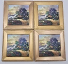 The Thomas Kincade 1997 A New Day Dawning Ambiance Coasters are a set of four square-shaped coasters featuring a cottage pattern in multicolor. These coasters are made of cork and ceramic, with a diameter of 4 inches and a thickness of 1 inch. They are from the Thomas Kincade franchise and were manufactured in the United States during the 1990s. These lightweight and stackable coasters are perfect for all occasions and should be hand washed only.
