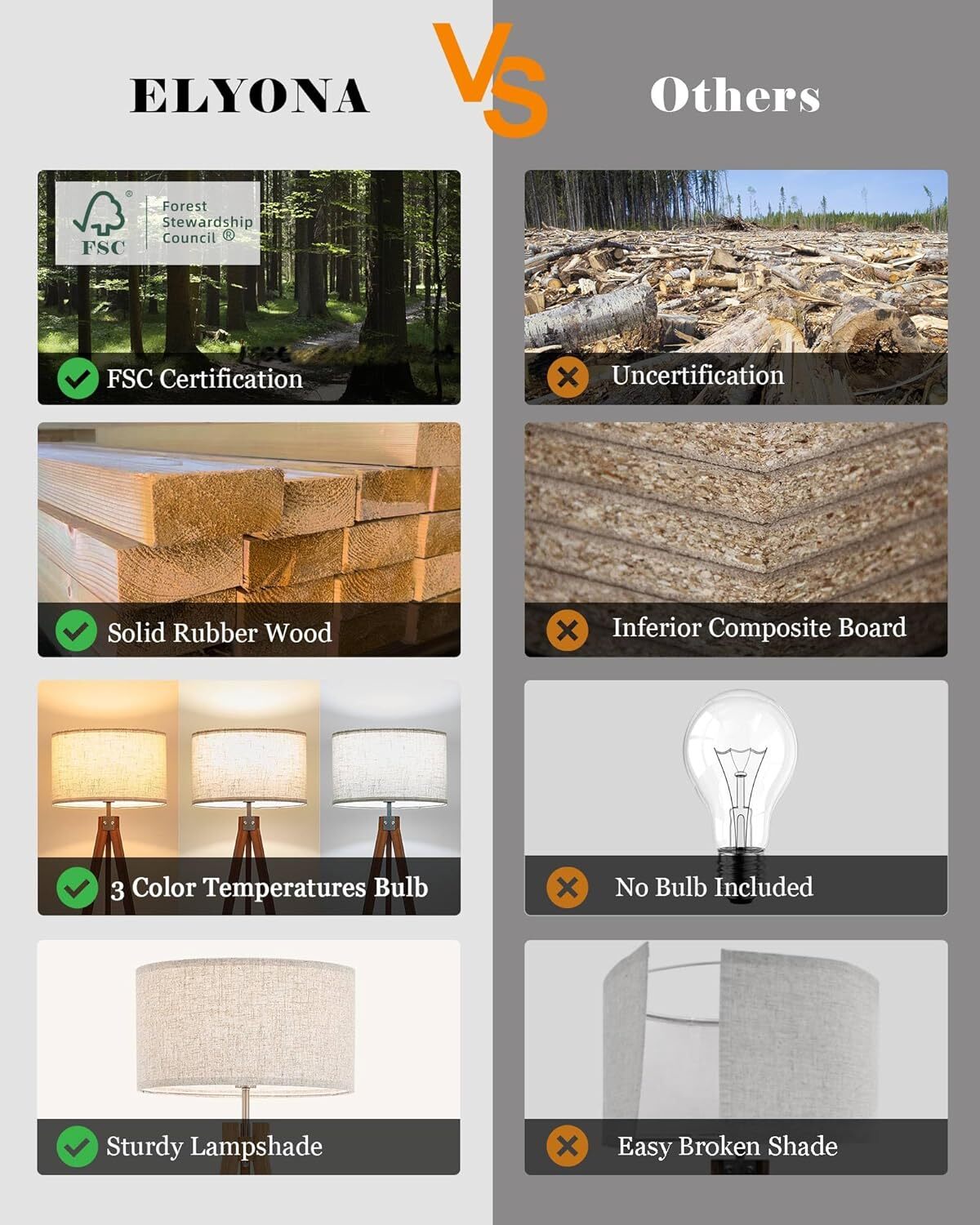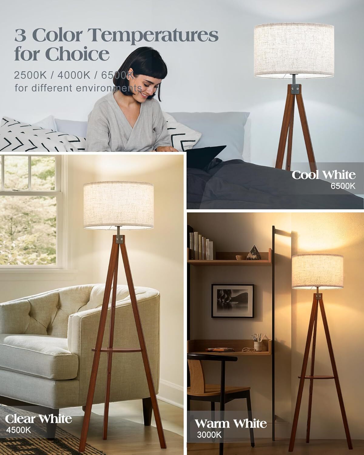 【Shelf Solid Wood Floor Lamp & Sturdy Tripod Legs 】There is no exactly the same wood grain in the world,each lamp is a unique individual,retain the breath of nature,retain the pure natural wood grain.Tripod Floor Lamp is hand-stained brown wood color, ideal for farmhouse, industrial,loft.The sturdy triangular design is ideal for homes with children or pets, reducing the risk of toppling. It also includes a side table for convenient storage of your phone, magazines, or a cup of tea. 【Why can you trust Solid Wood?】① All our wood is sourced from internationally certified legal forests by FSC, ensuring responsible harvesting that does not compromise ecological stabilit. Simultaneously we advocate against any form of illegal logging. ② "Derived from Nature, Returning to Nature" has been the guiding principle we uphold. Showing the beauty of solid wood lamp, and collaborate to lessen the environmental impact of plastics. Let's say "YES" to fostering a greener Earth. 【 3-Color Temperatures Bulb Included & Foot Switch 】①The foot switch allows easy on/off and light color adjustment. ②Includes a 3-Color Temperatures E26 LED Bulb (9W) offering 3000K warm light, 4500K natural light, and 6000K white light, suitable for various settings like bedroom night light or living room reading light. It also supports smart bulbs with built-in switch functions. ❥(Ensure replacement bulbs are under 60 Watts) 【Wood Maintenance & High Density Nature Linen Shade】①Simply wipe with a damp cloth, then dry. We have been coated with mineral oil before packaging, and we still recommend coating mineral or olive oil 1-2 times 3 month to make the wood grain more textured. ②We use high-quality primary color linen with tight texture, Water&oil-resistant nature linen shade, making the light more comfortable. It can be focused on any area you want to read, study, and work. 【ETL Listed & One Year Warranty】With over 20 years of illumination production experience and a professional design team, we have high strict control over product quality and detail & getting many patents for appearance design and functions at the same time. We offer One Year Warranty to bring you a great value shopping experience. If you have any questions, please CONTACT US via the Amazon message box.