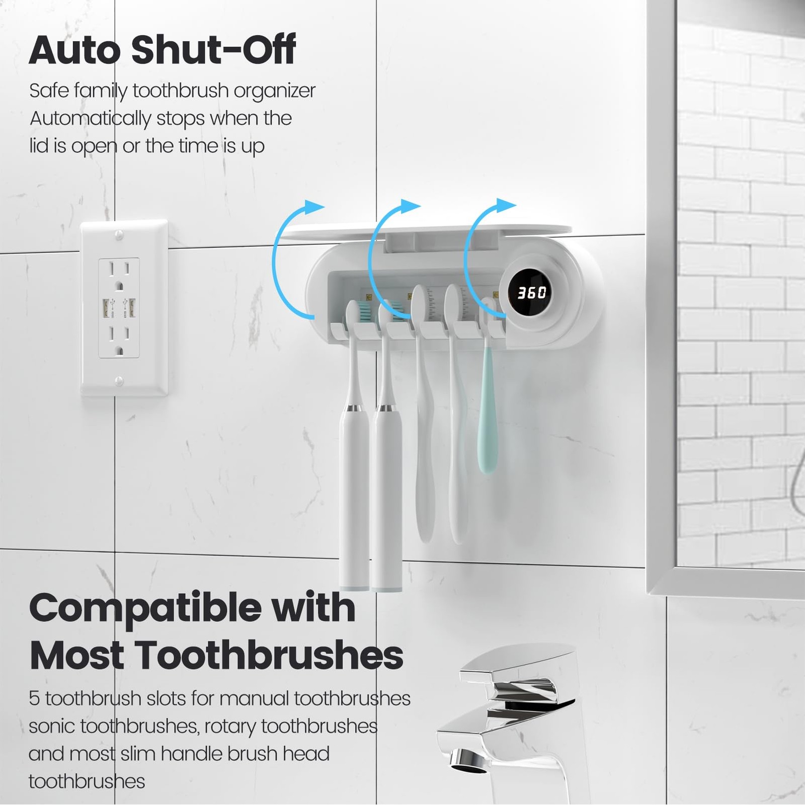 Toothbrush holder, EPA establishment number 96982-CHN-1 BATHROOM TOOTHBRUSH HOLDER: This toothbrush holders uses advanced 99.9% cleaning technology for a more sanitary way to your family’s toothbrushes. Keep your counters clutter-free and your toothbrushes clean! CORDLESS AND EASY TO USE: just press a button to refresh your toothbrush. Each cycle takes around 6 minutes and restarts with a button press. A full charge lasts up to 2 months AUTO SHUT-OFF & TIMER FUNCTION: The 360-second countdown display lets you know exactly when cleaning is complete. Plus, it automatically shuts off after each cycle or when the cover is opened 5 TOOTHBRUSH SLOTS: Keep your bathroom organized with a toothbrush holders wall that keeps each toothbrush ready for use. For the best results, dry toothbrush bristles before placing in the toothbrush holder WALL-MOUNTED: The toothbrush holder includes adhesive strips and screws, ensure the wall is dry before installing! Making installation a breeze on smooth, flat surfaces. For rough, damp or painted walls, use screws. (Package included Screws) RELIABLE SERVICE: We are dedicated to providing a satisfying experience for every customer. If you encounter any issues with your toothbrush holder, such as if it doesn't work, doesn't stick, doesn't charge, or stops working, our team is available 24/7 to assist you
