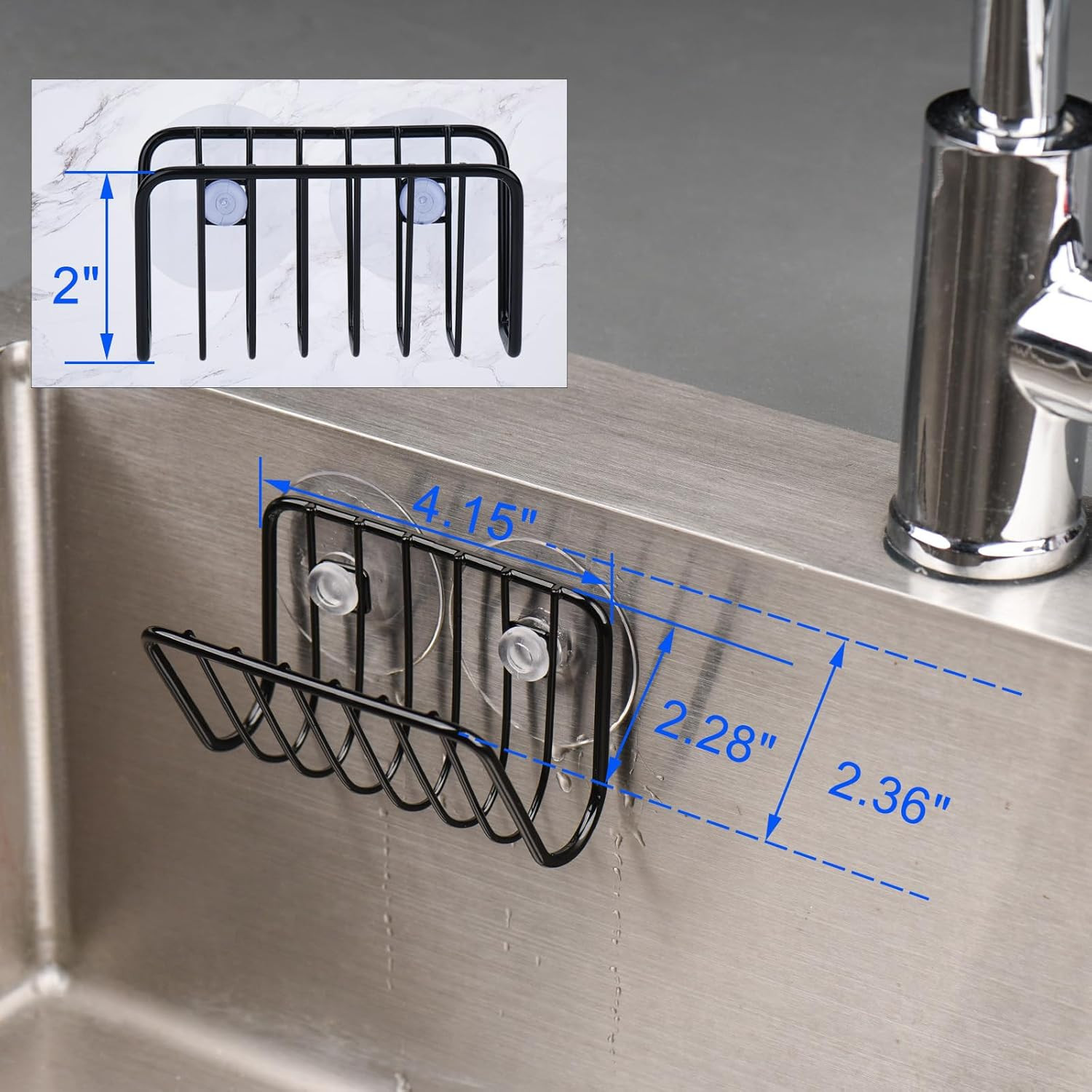 Toplife Sponge Holder for Kitchen Sink, Rust-Proof Set of 1, Matte Black Product Details Brand: Toplife Color: Matte Black Material: Alloy Steel Size: Set of 1 Product Dimensions: 2.36"D x 4.15"W x 2"H Style: Contemporary Installation Type: Countertop Finish Type: Brushed Shape: Triangular Drain Type: Grid Item Weight: 3.52 ounces Product Care Instructions: Wipe with Dry Cloth Hole Count: 3 Manufacturer: Orange ant Item model number: HMJ Is Discontinued By Manufacturer: No [Open Design] - This holder features an open design, making it easy to drain water and maintain cleanliness. It is constructed from high-quality steel and boasts a rustproof matte black finish, ensuring durability and a stylish appearance. [Multipurpose] - Toplife sponge holder can securely hold various kitchen or bathroom essentials, including soap, sponges, scouring pads, or drain stoppers. [Strong Suction Cups] - The product comes equipped with 2 robust plastic suction cups that provide a strong and secure attachment to smooth sink surfaces. Additionally, it includes 2 extra suction cups. [Use Instructions] - Simply stick the wet suction cup onto a smooth and clean surface and push out the air. Please note that this product is suited for smooth surfaces and may not work effectively on textured or porous surfaces. [Product dimensions] - The sponge holder is 4.15-inch x 2.36-inch x 2-inch in size.