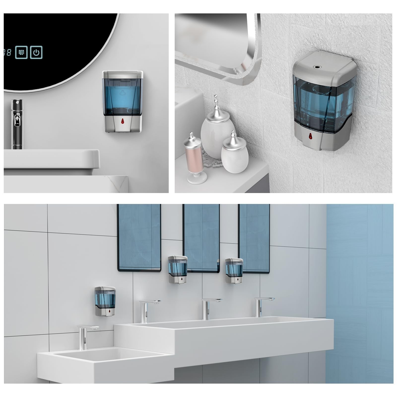 Commercial Automatic Liquid Hand Soap Dispenser for Bathroom and Kitchen Material: ABS plastic Container Capacity: 20fl.oz. Sensing Method : Infrared Sensor Power supply: By 4 AA batteries(not included) Wall-mount: Perforated Installation / Adhesive Installation. Liquid and Gel: Most free-flowing liquid and gel soap ((NOT including foam soap). Applications: Commercial public places: schools, hotels, hospitals, airports, offices, restaurants, medical facilities, etc. Also households near kitchen sinks, bathroom sinks, showers, or washbasins. Dimensions: 3.94L" x 3.74W" x 6.50H" Weight: 1.10 lb 【Customer Support】Our soap dispensers are tested before shipment, but if you encounter any issues, please contact us immediately. We will promptly arrange a replacement. Your satisfaction is our priority. 【Automatic Liquid Soap Dispenser】With advanced infrared technology, fast response in 0.25s. Touchless operation for better hygiene. Single-hand inductive operation, no bulky buttons, handicap-friendly. Powered by 4 AA batteries(not included). 【20fl.oz Capacity】Larger size (3.94" L x 3.74" W x 6.50" H) holds more soap, reducing refill frequency. 20 fl. oz/600ml capacity supports 500+ dispenses. Ideal for high-traffic bathrooms, meeting commercial demands. 【ABS & IPX4 Waterproof】ABS plastic resists fingerprints and water spots, keeping it cleaner. IPX4 waterproof rating ensures durability and longevity in wet environments. 【Wall Mount】Wall mount with screws or adhesive to eliminate bottle clutter and keep countertops organized. Requires a minimum installation gap: 10" for normal desktops, 13.8" for reflective desktops.