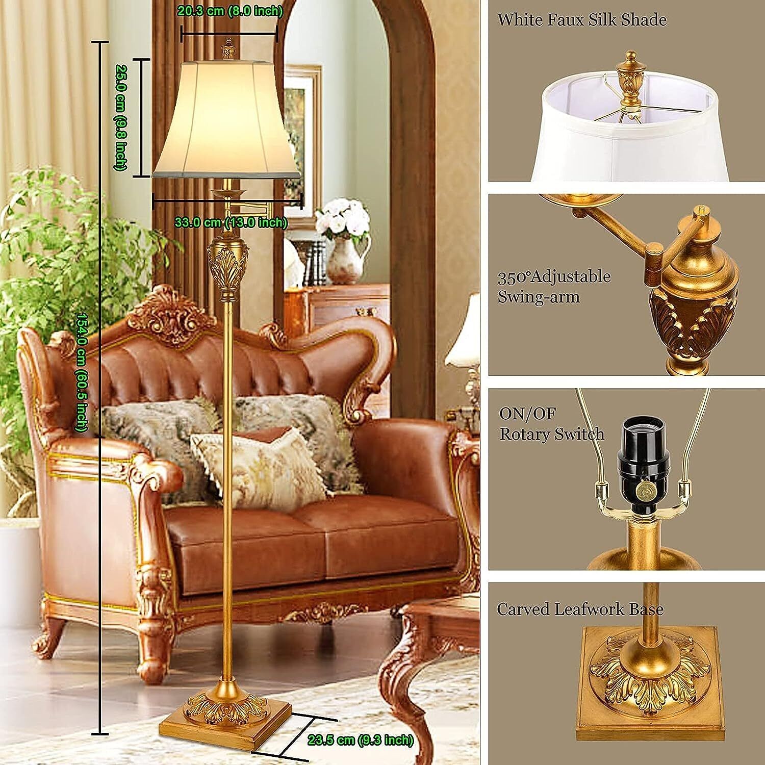 PERFECT DECORE AND VINTAGE DESIGN-- This Farmhouse Floor Lamp is elegantly sculpted, highly decorative, practical and it can be your bedroom lamp, pole lamp, reading lamp, Livingroom lamp, sewing lamp etc. The metal stem and base of our floor light has an oiled dark gold finish, which accentuates the bell-shaped lampshade to make a stunning look SAFE BASE AND ELEGANT LAMPSHADE-- We upgraded the Lamps, Bases, and Shades of this Farmhouse Décor. Its substantial base (9.3 * 9.3 inches) and sturdy holding pole provide stability and safety. The lampshade is made from durable faux silk fabric, which makes the light soft, eye friendly and is easy to clean PORTABLE & 350° ADJUSTABLE SWING ARM – The gold floor light is 60.5 Inches Tall, which is the Ideal Height for Providing a Gentle Glow. It's simple to move the lamp to where it's required. Its extending arm enables you to change the length of the light EASY TO INSTALL -- This classic standing floor lamp is easy to assemble without the use of tools; all you have to do is screw all of the lamp pole's components together according to the instructions (from socket to base), and you'll have an outstanding home enhancement in minutes WORRY FREE-- We gladly stand behind all of our items, offer a 1-year warranty, and value your statements in order to provide you with the best possible shopping experience On Oct 30, 2025 at 02:06:10 PDT, seller added the following information: On Nov 26, 2025 at 21:48:17 PST, seller added the following information: