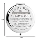 Sentimental Laser Engraving: Each mirror is delicately engraved with a heartfelt sentiment, expressing your love and appreciation for your wife. It's a romantic and personal touch that she will cherish. Elegant Gift Box: Our compact travel mirror comes in a stunning gift box that adds an extra touch of luxury. It's perfect for presenting this heartfelt gift to your wife on any special occasion. Compact and Convenient: With a 2.6-inch diameter, this mirror is designed to be portable and easy to carry, so your wife can have a handy reflection wherever she goes. Lightweight and Practical: Weighing only 3.1 ounces, this mirror is lightweight and won't be a burden in your wife's purse or travel bag. It's designed for her convenience and comfort. Perfect Romantic Gift: This compact travel mirror is an ideal romantic gift for your wife on special occasions such as Valentine's Day, Mother's Day, her birthday, your anniversary, or Christmas. Best Gift from Husband: Show your love and thoughtfulness by surprising your wife with this beautiful mirror. It's a heartfelt gift that she will treasure, reminding her of your love every time she uses it. Laser Engraving: TO MY WIFE: NEVER FORGET THAT I LOVE YOU. IF I COULD GIVE YOU ONE THING IN LIFE, I WOULD GIVE YOU THE ABILITY TO SEE YOURSELF THROUGH MY EYES. ONLY THEN WOULD YOU REALIZE HOW SPECIAL YOU ARE TO ME. LOVE HUSBAND