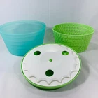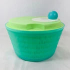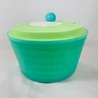 This Tupperware Salad Spinner with Storage Lid is a great addition to your kitchen. The set includes one large round container with a blue color and a lid to keep your food fresh. It has three compartments and three tiers, providing ample storage space. The container measures 10 inches in length and width and stands at 5.5 inches in height. The Salad Spinner is perfect for storing salads, fruits, and other vegetables. It comes with a slot for easy pouring and a lid to prevent spilling. The item is in excellent shape and has been well-maintained. It is a collectible item from the Tupperware brand, known for its durability and reliability.