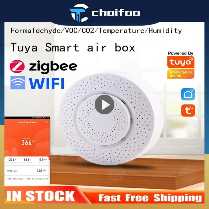 Tuya CO2 Carbon Dioxide Sensor VOC Detector NDIR High-precision Measurement Exceeds Standard Alarm Smart Home Linkage Tuya Senso Description: Working temperature: -20--85℃ Working voltage (rated): 4.8-12V Working current: 10-496ma Size: 90*90*35mm Power supply mode: USB 5V/1A Communication protocol: WIFI 2.4GHZ color: White Shell material: PVC Examination range: Formaldehyde: 0-10.0 (mg/m3) VOC: 0-99.9 (ppm) Carbon dioxide: 0-1000 (ppm) Temperature: 0-60 (℃) Humidity: 0-95 (%) After being paired to the APP, it can be linked with various smart home products. For example, when detecting excessive formaldehyde/VOC, the smart air purifier is automatically turned on; when the carbon dioxide is exceeded, the smart fresh air fan is automatically turned on; when the temperature is abnormal, the air conditioner temperature is automatically adjusted ; When the humidity is too low or too high, the smart humidifier will be turned on/off automatically; when a certain parameter is detected to exceed the standard, a message will be sent to the alarm (the above smart linkage function needs to be matched with the smart home product) 100% Brand New and High Quality! Smart air box is the home of intelligent device for remote monitoring of air environment,It can also detect formaldehyde, VOC of poisonous gas, CO2, temperature, humidity and so on 5 kinds of environmental parameters,In environmental parameters exceed bid automatically when the graffiti smart home air conditioning, new fan, humidifier, air purifier on household environment optimization. The detection range of the smart air box: formaldehyde, VOC gas, CO2, temperature, humidity Specifications: 1. 100% Brand New and High Quality:The product is 100% brand new and of high quality. 2. Smart air box:It is a smart air box that serves as the home for an intelligent device for remote monitoring of the air environment. 3. The detection range of the smart air box::The detection range of the smart air box covers formaldehyde, VOC gases, CO2, temperature, and humidity. 4. Optimizing the home environment:When the environmental parameters exceed certain levels, the graffiti smart home air conditioning, new fan, humidifier, and air purifier automatically adjust to optimize the household environment. 5. Improving the quality of living environment:The smart air box is a reliable and convenient solution for improving indoor air quality and creating a healthier living environment. Package Included: smart air box X1 Instruction for use X1 Card pin X1 USB power supply cord X1 Notes: please do not put air box at lampblack is too big, strong convection air or in high concentration organic gas for a long time, otherwise it will damage the sensor.