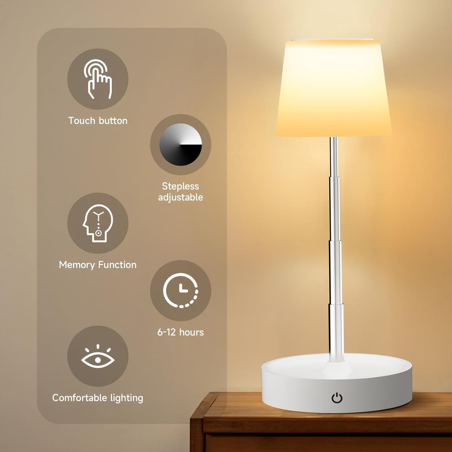 Ideal Reading - Users can easily customize the lighting to their preference, making it ideal for reading,and warm light for a sleeping atmosphere. LONG PRESS can adjust the brightness. Minimalist Design - Put all together for a minimalism lamp is really perfect to decorate anywhere of your house. An ideal USB nightstand lamp for bedroom, guest room, living room, study room, kids room for girls and boys, office room, desk, etc. at the same time. Soft Light - Unlike other dazzling side table light lamp, soft light protect you and your kids and family's eyes from eye strain, or eyesight damages. Rechargeable - Nightstand Lamp with Type-C charging port, charges anytime, no longer worry about a power outage & wasting money on battery. nightstand lamp accompany U all sweet night. The natural and elegant table lamp appearance allows it to be placed anywhere in the house. COMPREHENSIVE AFTER-SALES COMMITMENT - This Dimmable Led Table Lamp which makes it a perfect present for your friends and family. If for any reason, you are dissatisfied with the Dimmable Led Table Lamp, please reach out to us immediately, and we will respond within 24 hours. Product Description
