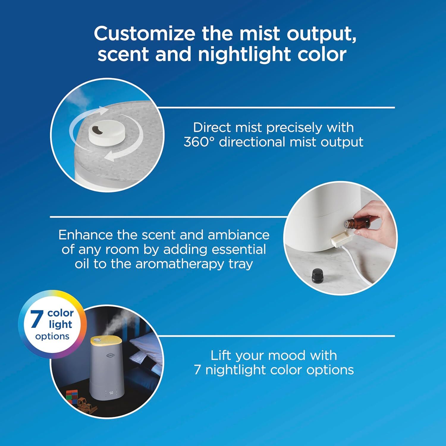 Product Description Ultra Clean Cool Mist Air Humidifier for BedRoom with UV LED Light to Reduce Germs and Bacteria, Whisper Quiet, 4L Water Tank for up to 40 Hours of Continuous Steam, White (11080) STAYS CLEANER LONGER WITH GERM-REDUCING TECHNOLOGY*: This room humidifier requires less cleaning than traditional humidifiers. The UV LED light in its base helps reduce growth of bacteria and mold in the water and on the surfaces of the water tray. EASY TO FILL AND CLEAN WATER TANK: The top-fill water tank of this cool mist humidifier has a large opening and an obstruction-free design for easy access. You can quickly fill it at the sink, and the top opening makes filling and cleaning easy. ADJUST THE MIST OUTPUT TO MATCH YOUR NEEDS: Enjoy up to 40 hours of continuous humidification on the lowest mist setting or quickly humidify dry air with the medium or high setting. The powerful mist output lets you quickly raise the humidity in any room. AUTOMATICALLY MAINTAIN TARGET HUMIDITY WITH AUTO MODE: This air humidifier lets you keep your humidity at your target level. Select your preferred humidity, set the mist output and walk away — it will cycle on and off to maintain your target level. SLEEP MODE IS PERFECT IN BEDROOMS: Since it's no louder than a whisper at 30 dB, sleep mode of this home humidifier is great for children's rooms, light sleepers or anywhere quiet is needed. About Us We are a reputable seller with many years of experience selling on eBay. Our goal is to provide high-quality products and excellent customer service. Shipping Items will be shipped within 1-3 business days when we received payment. (Orders are not processed on weekends & holidays) Tracking information will be sent once item is shipped. Delivery time depends on destination and other factors Item is shipped to ebay address. Leaving correct address can minimize delay. For international shipping and shipping to Guam, Hawaii and Alaska, Please contact us before placing the order. International buyers please note: Import duties, taxes and charges are not included in the item price or shipping charges. These charges are buyer’s responsibility. We will try our best to reduce the risk of the custom duties. Local pick-up is unavailable at the moment. Contact Us We reply any email messages within 1 business / working days(off-duty at weekend). If you do not get a response from us, then please check your junk or spam mailbox. Our Business hours: Mon-Fri 9:00-18:00, UTC/GMT +8 hours. Please contact us either by clicking "contact seller" in the "purchase history" section or simply click "ask a question" at the bottom of this page. If you are unsatisfied with our item or service, please contact us before leaving any feedback. We are committed to resolve all issues in a friendly and satisfactory manner.