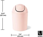 Umbra 1.25-Gallon Mini Waste Can w/Swing-Top Lid - Small Garbage Bin for Pink Product Details Brand: Umbra Capacity: 1.25 Gallons Color: Pink Opening Mechanism: Swing-Lid Material: Polypropylene Recommended Uses For Product: cabinets, such as a bathroom, office or bedroom. Room Type: Bathroom,Bathrooms,Bedroom,Bedrooms,Office Special Feature: Removable Lid Shape: Cylindrical Finish Type: Polypropylene Item Weight: 10.23 Ounces Product Dimensions: 7.5"L x 7.5"W x 12.5"H Unit Count: 1.0 Count Manufacturer: Umbra Item Weight: 10.2 ounces Finish types: Polypropylene Batteries required: No High-Quality Construction: Each Umbra 1.25-Gallon Mini Waste Can with Swing-Top Lid is expertly crafted using durable, recycled polypropylene plastic with a high-gloss finish, reducing waste while supplying long-term, reliable use for years to come. Sleek, Modern Design: Modern and refined in design, the Mini Waste Can from Umbra takes the classic, cylindrical shape of garbage can – topped with a domed, swing-top lid to keep your garbage discreetly covered and the bag inside securely in place. Compact Size: Measuring 7½” W x 12½” H in size, the Umbra Mini Waste Can with Swing-Top Lid holds 1.25 gallons (5 L) of trash, making it a great choice and perfect addition for use in small spaces and under cabinets, such as a bathroom, office or bedroom. Choice of Colors: Umbra’s 1.25-Gallon Mini Waste Can is a stylish and practical garbage can that takes up minimal floor space in any location. It’s offered in a variety of vibrant color choices to accommodate everyone’s taste and complement any decor Keep your trash contained and discreetly covered in a fashionable way. Modern and refined in design, each Umbra 1.25-Gallon Mini Waste Can takes the classic, cylindrical shape of a garbage can – a stylish and practical addition that can be neatly tucked into awkward spaces or small corners. To top it off, a domed swing-top lid sits comfortably on top to keep bags securely in place while keeping your trash out of sight. Stylish and compact at 7½” W x 12½” H (19 cm x 32 cm) in size, Umbra’s 1.25-Gallon (5 L) Mini Waste Can with Swing-Top Lid is perfectly sized to fit in small spaces and underneath cabinets. It takes up minimal floor space yet provides enough room for waste, making it a great choice for collecting rubbish in any bathroom, bedroom or under your desk in the office. This petite trash can is made using recyclable polypropylene plastic to minimize waste, while providing long-term durability to ensure reliable use for years on end. Best of all, this material is easy to clean. Simply wipe it down with a damp cloth or paper towel when needed and it will look as good as new. Mini trash cans don't have to compromise on style. Looking just as good when left out on display as it will tucked under a cabinet, the Umbra 1.25-Gallon Mini Waste Can with Swing-Top Lid is a compact, contemporary and functional accessory that can be used in any interior setting. From neutral black and white; to metallic-colored bronze and silver; all the way through to vibrant red, shades of blue, eye-catching patterns and colors in between – each one boasting a high-gloss finish – there’s an Umbra Mini Waste Can to suit everyone’s taste and enhance any existing decor.