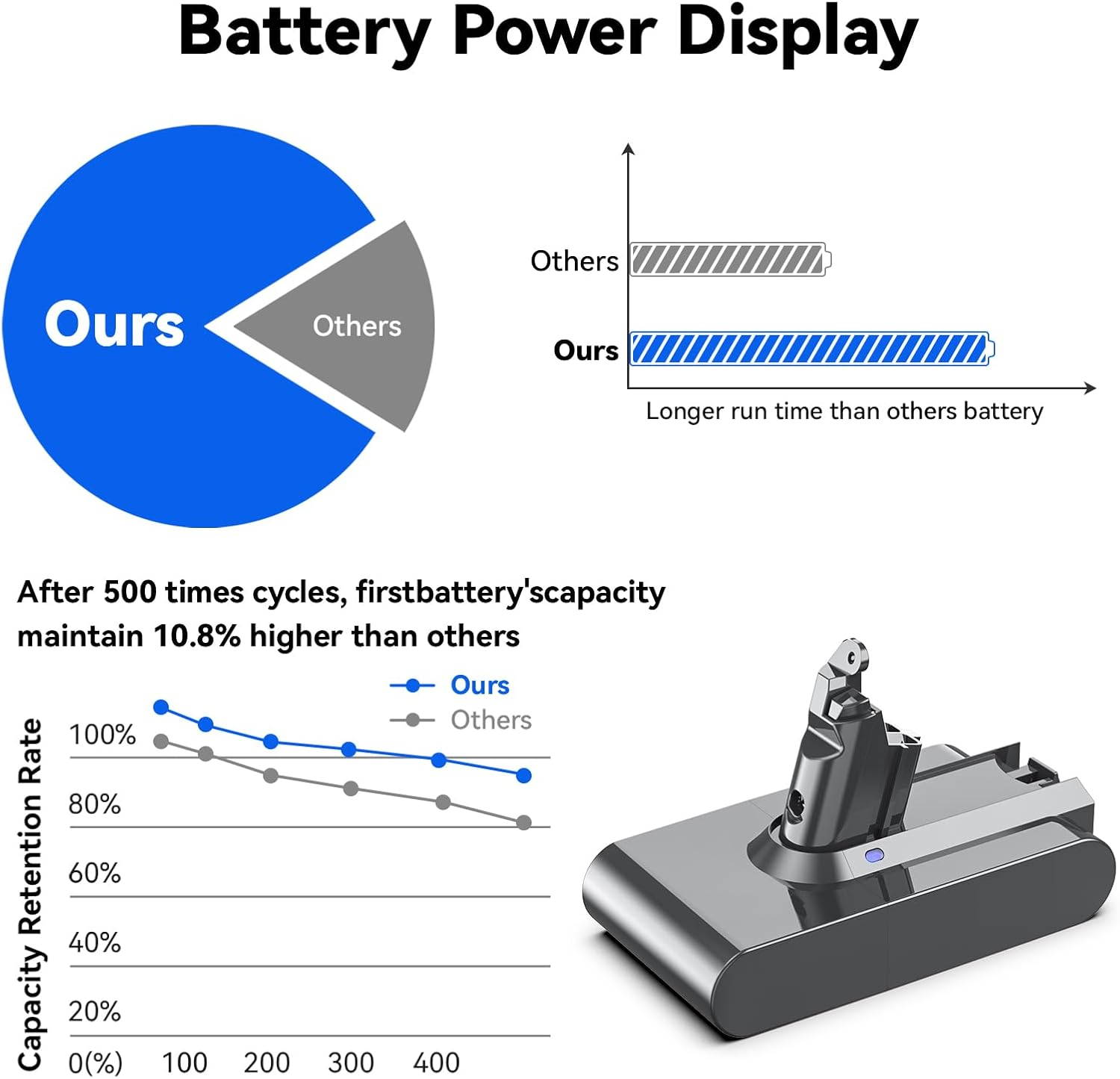 Store New Arrivals Add to Favorite View Feedback Upgraded 6000Mah V6 SV04 Vtc4 Battery 967810 Replacement Battery for Dyson V6 Animal Absolute Motorhead Slim SV03 SV04 SV05 SV06 SV07 SV09 Vtc4 DC58 DC59 DC61 DC62 DC72 DC74 V6 Handheld Stick Vacuum Description Item model number Dyson V6 Batería Battery Cell Composition Lithium Ion Brand POWTREE Country of Origin China Item Weight 15.2 ounces Batteries 1 Lithium Ion batteries required. Recommended Uses For Product For Dyson V6 Battery Replacement Number of Batteries 1 Lithium Ion batteries required. Manufacturer POWTREE Package Dimensions 6.73 x 3.98 x 3.31 inches Compatible Phone Models Dyson V6 Battery 🌳【Battery Type】Battery type: Lithium-ion Voltage: 21.6V, Capacity: 6000mAh. No memory effect, no pollution, and low self-discharge, can be charged or discharged as needed without loss of capacity. 100% compatible with original charger. 🌳【Compatibility】The Dyson battery is comfirmed to equal to original Dyson V6 SV04 Vtc4 Battery. Perfectly compatible for 965874-02 967810-03 967810-02 967810-23 210405-01 210692-01 210691-01 209560-01 209476-01 209472-01 209432-01 204720-01. It also fits the original docking station and charger. 🌳【Upgraded Capacity】Upgraded 6000mAh replacement battery, higher capacity than original 2100mAh batteries, Support Max Mode suction power. Providing more power for your Dyson V6 vacuum. 🌳【High Quality】Battery uses the highest quality cells, safe with rapid-charge technology while providing overload protection, over current protection, short circuit protection, high temperature protection, to make sure you can use the vacuum cleaner safely. 🌳【Buy Worry-free】We provide 30 days money back, 12 month free replacement, Please contact us via Amazon message for warranty information. We will try our best to promise you an enjoyable shopping experience. Welcome to share your feelings with us. Dyson v6 Battery Vtc4 hhd10395 dyson max battery 214141 Replace Part Number: 965874-02 967810-03 967810-02 967810-23 210405-01 210692-01 210691-01 209560-01 209476-01 209472-01 209432-01 204720-01 Fit for V6 Series Model: (Pls use "Ctrl+F" to find your model) V6 Absolute,V6 Animal , V6 Motorhead, V6 Slim. DC58 DC59 DC61 DC62 DC72 DC74. SV03 SV04 SV05 SV06 SV07 SV09, 595 650 770 880 vacuum V6 Car+ Boat,V6 Top Dog,V6 Mattress,V6 Trigger, V6 Trigger Pro Excl, V6 Multifloor Exclusive, V6 Top Dog HEPA, V6 Trigger Extra, V6 Baby+ Child Vacuum ABOUT US We offer the best prices around on high quality products. Our E-store includes media such as books, movies, music and games while offering electronics, toys, sporting apparel, clothing, tools, general home, garden items and more. SHIPPING We are always working hard to ensure your package arrives as soon as possible. Please understand that some factors like weather, high postal traffic, and the performance of shipping companies are outside of our control. We offer free shipping to the lower 48 states and ship within 2 business days of payment, usually sooner. We do not accept P.O. Boxes. Please provide a physical address. RETURNS We offer a 30-Day Return Policy on items which you are not completely satisfied with. You have the option for a full-refund or an exchange of the item. No returns are available on items shipped outside of the USA. PAYMENT We accept PayPal. CONTACT US This page content is yet to come Please ad us to your favorite seller and visit again later Thank You