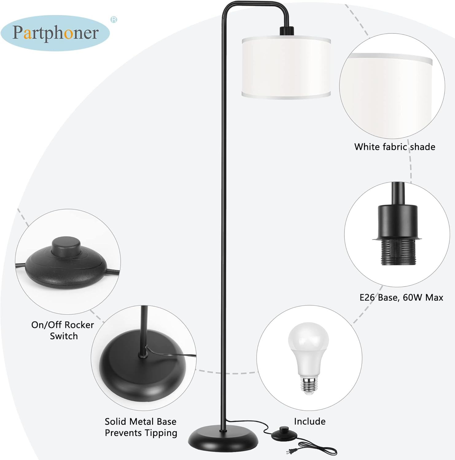 Store New Arrivals Add to Favorite View Feedback [Upgraded] LED Floor Lamp for Living Room, 3 Color Temperature Floor Lamp with Foot Switch Modern Standing Lamp Tall Pole Floor Reading Lamp for Bedroom, Study Room, Office, 9W Bulb Included, Black Description Item model number STR-FL-0162 Light Source Type LED Style Modern Number of Items 1 Power Source Corded Electric Number of Light Sources 1 Control Method Touch Lighting Method Downlight Lamp Type 3 color temperature floor lamp Number of Pieces 1 Room Type living room bedroom study room Bulb Shape Size B10 Installation Type Hanging Product Dimensions 9.2"D x 11.8"W x 64.1"H Material Metal and Fabric Efficiency Energy Efficient Age Range (Description) Adult Controller Type Foot Control Finish Type Matte Specific Uses For Product Reading Manufacturer PARTPHONER Indoor/Outdoor Usage Indoor Bulb Base E26 Water Resistance Level Not Water Resistant Batteries Required? No Item Weight 8 Pounds Connectivity Technology USB Special Features Corded Special Feature Corded Part Number STR-FL-0162 Shade Color White Mounting Type Pole Mount Color Black Wattage 9 watts Is Cordless? No Base Material Metal Is Waterproof False Shape Bulb Voltage 110 Volts Recommended Uses For Product Reading, Decoration Shade Material Linen Finish types Matte Included Components Shade Brand PARTPHONER Switch Type Foot đĄă3 Color Temperature LED Bulbs IncludedăOur Modern Floor Lamp includes a 9 W LED E26 bulb.The bulb has 3 color temperatures that can be adjusted 2700K/4000K/5000K, and creates 810LM sufficient brightness for your life.The standing lamp suit for all room style, such as the softness of warm light brings you a warm feeling,and the brightness of cold light brings you a good reading environment and protects your eyes. đĄăConvenient pedal foot switchăThe living room floor lamp build with pedal switch, It allows you to tap the lamp on or off with your foot and spare our hands to do something else, making it the most suitable lighting option for reading, studying or working . Its cord length is 70.8 '' which is long enough to extend from the socket to the seat, sofa, armchair, etc., and can be easily moved to where you need to use it without taking up too much visual space. đĄăStylish and modern designă Modern classic floor lamp is suitable for contemporary architecture and decor, fits any room style. A drum white linen lampshade perfect matched with the black metal lamp pole completes the contemporary look, making well suited to a light airy bedroom or sunny family space. Perfectly combined with the warm tone of the lampâs illuminated, the fabric linen lampshade helps diffuse the light to make soft on eyes and reduce eyestrain, creating a comfortable atmosphere. đĄăPerfect for all occasion ă whether you read books in a recliner or work at a desk, this classic floor lamp fits easily beside your furniture. Its slender design allows it to position well near sofas, armchairs, side tables etc. The bedside standing lamp can be meet your basic lighting needs. đĄăEasy use and no Worryă everything came with the package, just screw a few tubes together and then you can enjoy the led floor lamp immediately. Besides, we provide a 1-year warranty, if you have any questions, please feel free to contact usïŒwe will respond within 24 hours to provide the most satisfactory solutions and services. Product Description PARTPHONER Stylish & Modern 3 color temperature black floor lamp with white lampshade and foot switch tall pole floor reading lamp 9W led bulb include, provides soft and natural light for reading and working in your home or office. Light Up Your Sweet Home! Minimalist Design for All occasions A white linen lampshade hangs on the black lamp pole that gives a aesthetically classic look, this dimmable floor lamp showcases your unique taste and delicately highlights multiple interior styles such as modern, traditional, mid-century decoration in any spaces like living room, bedroom, study room. Classic Linen Lampshade & Convenient Foot Switch & Sturdy Metal Safe Base Equipped with a foot press on and off power switch, this modern-style standing lamp is very easy to turn on and off. It allowing you to easily switch the light on/off with your foot, saves you the trouble of bending down to turn off the light. Spare your hands to do anything else you want. And the metal base has excellent stability which will prevent falling when it's knocked by kids or pets. Easy Installation ABOUT US We offer the best prices around on high quality products. Our E-store includes media such as books, movies, music and games while offering electronics, toys, sporting apparel, clothing, tools, general home, garden items and more. SHIPPING We are always working hard to ensure your package arrives as soon as possible. Please understand that some factors like weather, high postal traffic, and the performance of shipping companies are outside of our control. We offer free shipping to the lower 48 states and ship within 2 business days of payment, usually sooner. We do not accept P.O. Boxes. Please provide a physical address. RETURNS We offer a 30-Day Return Policy on items which you are not completely satisfied with. You have the option for a full-refund or an exchange of the item. No returns are available on items shipped outside of the USA. PAYMENT We accept PayPal. CONTACT US This page content is yet to come Please ad us to your favorite seller and visit again later Thank You