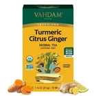 VAHDAM, Organic Turmeric Citrus Ginger Herbal Tea (18 Count) Caffeine Free, Gluten Free | 100% Pure Herbal Blend - Citrusy & Savory | Eco-Friendly Individually Wrapped Tea Bags | Direct from Source Description Features: Harvested in India - Turmeric Citrus Ginger Herbal Tea crafted with turmeric, ginger, and lemon sourced directly from Indian farms, with no middlemen involved, grown sustainably and free from artificial flavors. Citrusy Turmeric Ginger Tea - Our tea offers a warming spice of turmeric and ginger with a balance of tangy citrus note from lemon with a hint of natural sweetness. Being caffeine-free it's perfect for any time of the day. A Brand With a Billion Dreams - Feel alive with VAHDAM Indias premium teas. A leading global brand, we ship to over 3 million customers in 130+ countries. Proudly carbon-neutral and plastic-neutral, we invest in environmental sustainability under our home-grown, sustainable label. Ethical, Direct & Fair-trade - Our supply chain ensures you get the freshest tea while farmers receive fair prices. We reinvest 1% of our revenue into the education of our tea growers' children through our Teach Me initiative, honoring their aspirations and supporting their future. Product Details: Brand: VAHDAM Item Form: Teabags Flavor: Turmeric Tea Variety: Turmeric Unit Count: 1 Count Package Dimensions : 5.2 x 3.19 x 2.8 inches; 2.4 ounces UPC : Manufacturer : VAHDAM Country of Origin : India Handling We will ship all orders within 3 business days of payment. Delivery We do not ship outside of the Continental US. Feedback We take our reputation seriously, we buy and sell online, so we understand the value of trust. If you are unsatisfied with your order, please contact us and we will work with you to resolve it to your satisfaction.