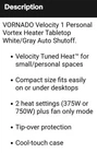 VORNADO Velocity 1 Two Settings Space Heater And Fan Compact Auto Shutoff Very clean pre-owned condition Working space heater 2 heat settings and 1 fan setting Works great in small spaces especially around your feet Has auto shut off if it gets knocked over Thank you for looking
