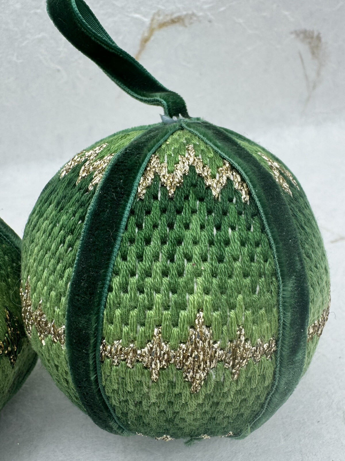 π Add some vintage charm to your Christmas decorations with this lot of two handmade crocheted sweater ornaments. π These round balls have a 3-inch diameter and feature a knit sweater pattern with velvet ribbon accents. π The green and gold color combination adds a festive touch to any holiday display. π These ornaments are perfect for collectors or anyone looking for a unique and personalized holiday decoration. π They are vintage and handmade, making each one-of-a-kind. Whether you're adding them to your ornament collection or using them as a thoughtful gift, these crocheted sweater balls are sure to bring joy and warmth to any Christmas occasion. ππ Preowned vintage condition. NOTE: one has minor discoloration/stain. SOLD AS IS π Please view photos for closer inspection and more details. Thanks for shopping π