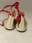 Add a touch of vintage charm to your Christmas ornament collection with these handmade doll shoes ornament. The ivory off white color and pearl like buttons with strap make them a perfect addition to any doll collection. These shoes are small in size, but the length and width can be seen in the pictures provided. The shoes are made with a stitch and glue production technique and are antique with a vintage style. They are suitable for any recipient over 18 years of age and are a unique addition to any collection. These shoes are a perfect gift for anyone who loves collecting vintage ornaments.