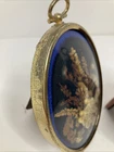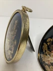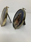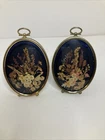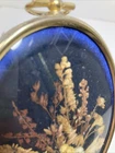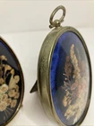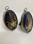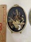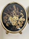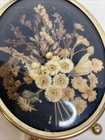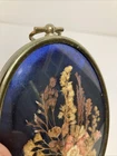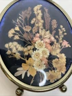 This is a set of two vintage oval framed pressed floral art pieces featuring dried flowers on a rich deep blue velvet. The frames are made with curved glass, giving the artwork a convex shape. These handmade pieces are crafted in the United States and showcase multiple types of dried flowers or flower buds. Ideal for adding a touch of natural beauty to any room or space.