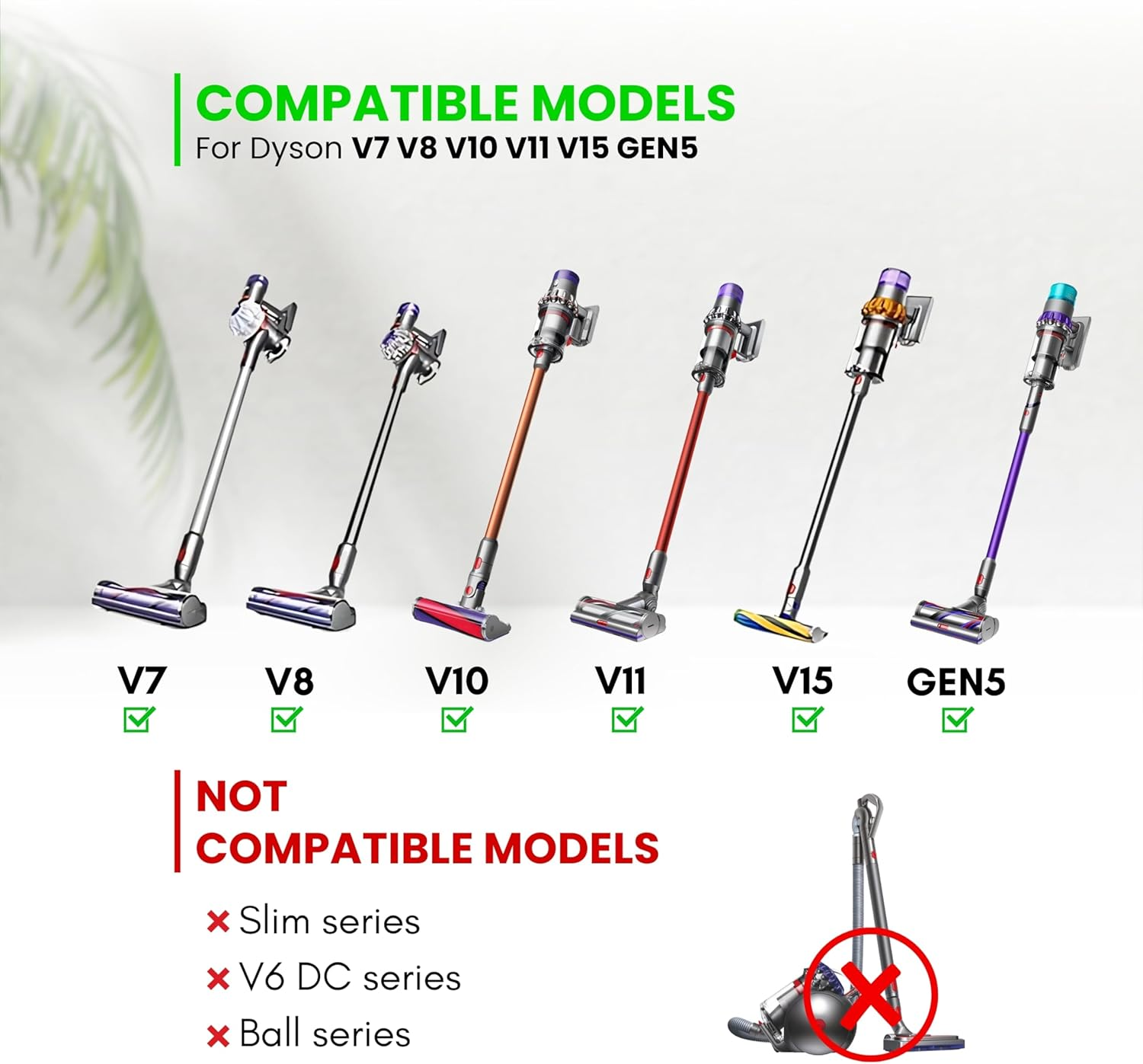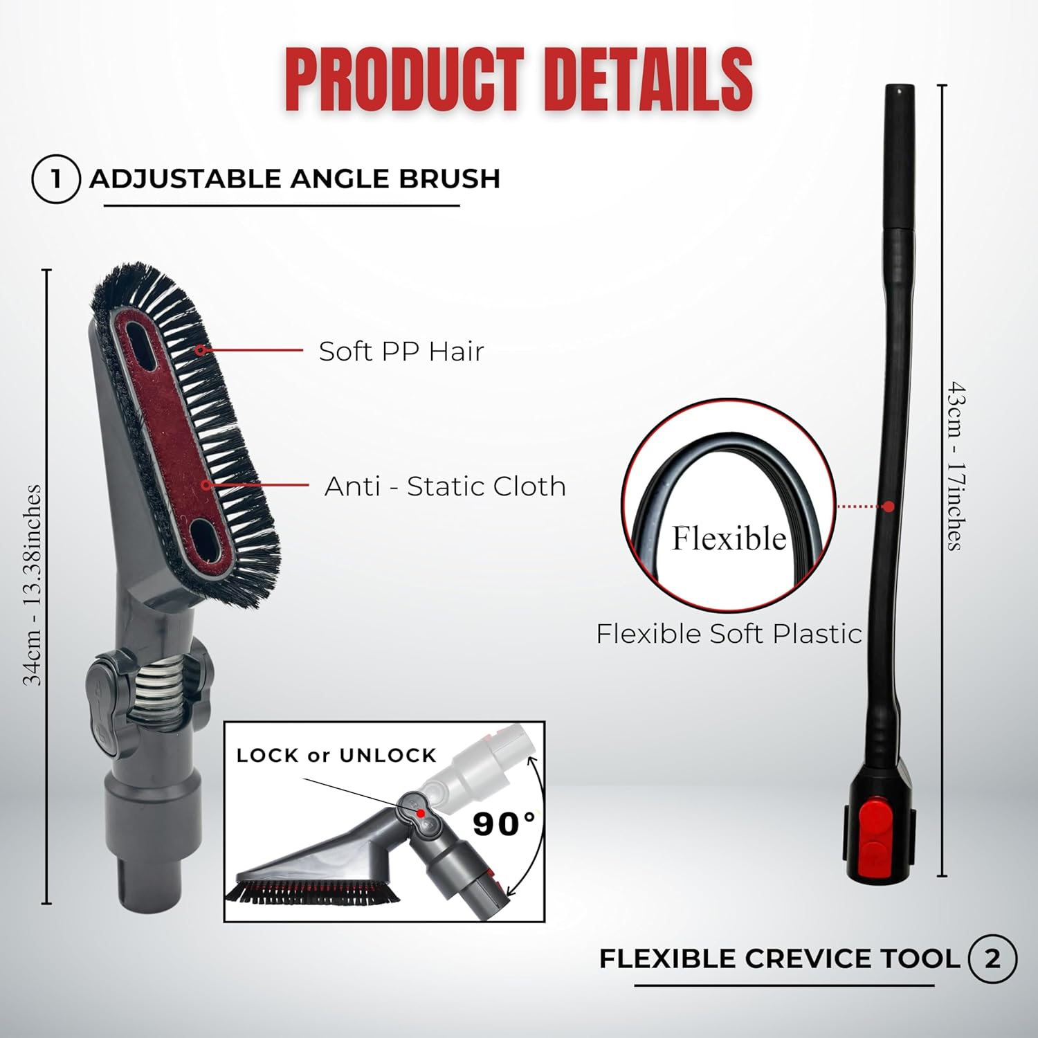 🌟Dryer Vent Vacuum Cleaner Attachment for Dyson: Compatible with Dyson handheld cordless V15 V12 V11 V10 V8 V7 detect, detect+, outsize, torque drive, absolute, fluffy, animal, cyclone, total clean, car+boat vacuum cleaners. 🌟Flexible Crevice Tool for Hard to Reach Place: can tackle dust in hard-to-reach places around your home and car and can remove lint from the dryer vent as well, Great for corner, heating ducts, under furniture and car seat, along side the refrigerator. 🌟Ceiling Fan Vacuum Cleaner Attachment for Dyson: Soft bristle vacuum brush ensures gentle yet effective cleaning Ideal for cleaning vents, ceiling fans, top of furniture, and mini blinds 🌟High Reach Vacuum Attachment: Features an adjustable angle for enhanced reach and maneuverability. Perfect tool for dusting on dressers, bookshelves, and lamps. Ideal for cleaning vents, ceiling fans, top of furniture, mini blinds and orther places that is hard to reach. 🌟Pet Hair Removal Vacuum Attachment: This brush head is easy to clean pet hairs sticks on all sufaces Product Description Why Should Choose this Set? Clean Anywhere in Your Home with Us! Wide Compatibility