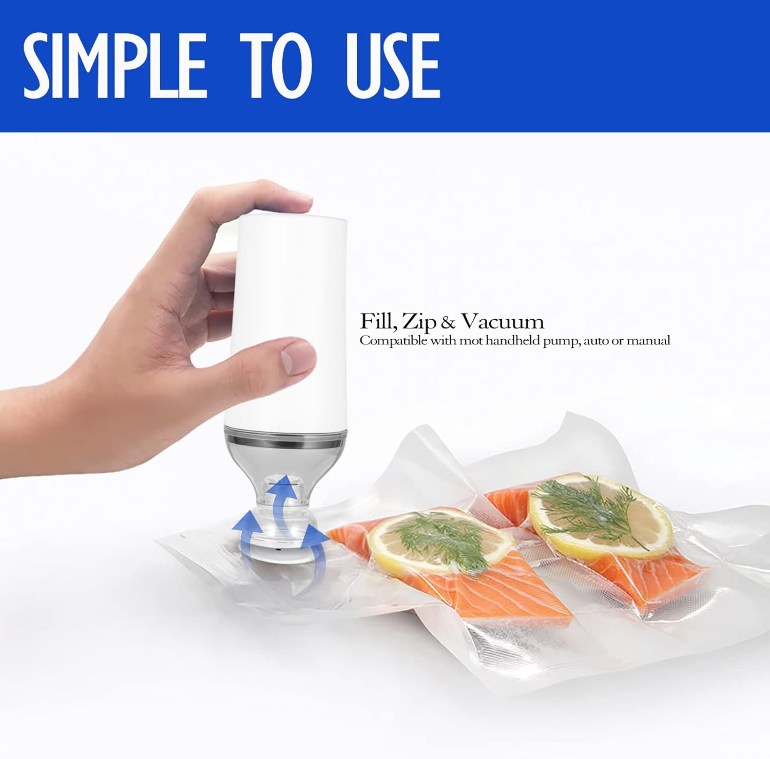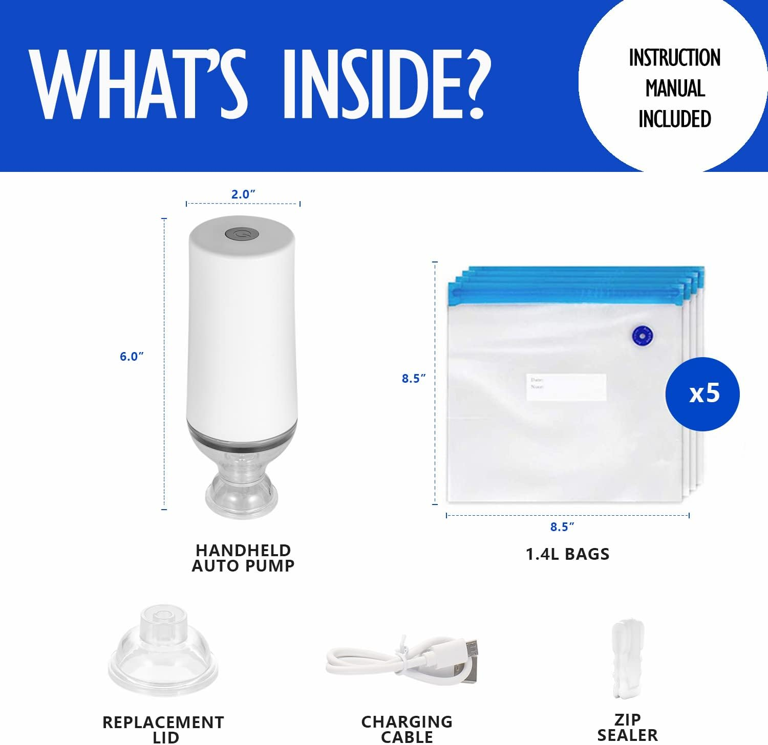 Portable Mini Vacuum Sealer Pump with Five Bags Included: One rechargeable handheld pump; five reusable zipper bags, 9.8 inch in length and 8.3 inch in width; one replacement air valve; one instruction manual Keep Food Fresh: Create an airtight barrier around food, blocking moisture and oxygen to extend freshness and locking flavors; lock nutrients in and help food fresh up to 5x longer; slow down food spoilage and keep food tasty and delicious Simple and Convenient: Portable mini vacuum sealer forms and functions combined with a compact design and easy-to-use manual operation to preserve a variety of food; simplified vacuum process by automatically remove air and seal with the press of a button Safe Vacuum Sealer Bags for Sous Vide Cooking: Constructed of excellent-quality and multi-layered BPA-free material, means there are no harmful chemicals in the plastic that could possibility contaminate your food One Bag, Multiple Uses: Sous vide cooking; buying in bulk and store the extra for later; portioning out meals throughout the week; picnics, hiking and camping hunting and fishing; pantry storage; leftovers storage; space saver for cloth storage and travel Product Description VICARKO Portable Vacuum Sealer Pump and Bags From meal prep and portion control to preservation and packing, VICARKO Portable Vacuum Sealer Pump and Bags allows you to help keep foods fresh longer in your fridge and pantry. Plus the vacuum sealer bags fit any Sous Vide cooker, making Sous Vide cooking an ease. VICARKO delivers healthy, fresh food every day! Features Versatile Great for everyday use with deli meats, cheeses and other refrigerated foods USB Charging Cordless, compact and easy-to-use Convenient One-touch operation vacuums and air-tight with the press of a button Easy Storage Vacuum Sealer Bags can be conveniently stored in a fridge and pantry, keeping food fresh
