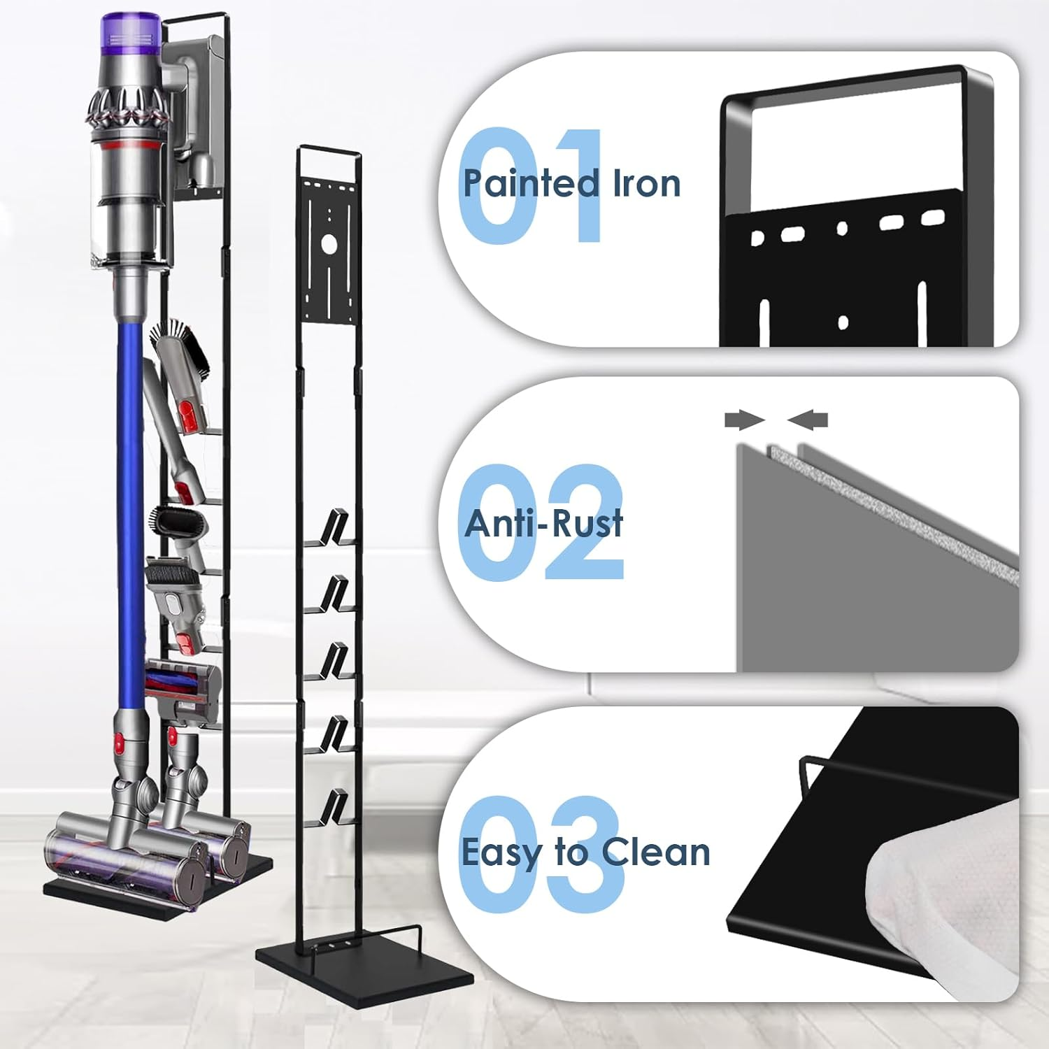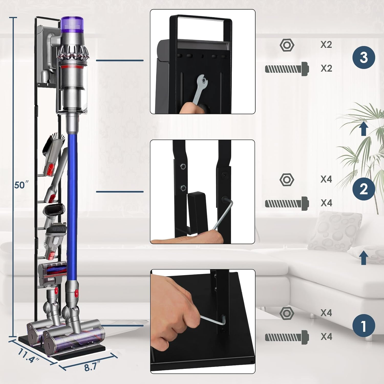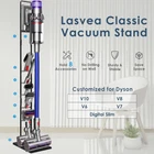 【VACUUM CLEANER COMPATIBILITY】 Vacuum stand is prefect for Dyson V15 V12 V11 V10 V8 V7 V6 DC30 DC31 DC34 DC35 DC58 DC59 DC62 DC74 Handheld Cordless Vacuum Cleaner. Easy way to install Central Vacuum Parts.The Power Button On/Off Control Clamp is given as a Gift. 【5 HOOKS, KEEP 9 HEADS】 Lasvea attachment holder has 5 hooks, Max. keep 9 suction heads. The Vacuum stand does NOT includes Dyson vacuum cleaners、docking station and suction heads. 【DRILL-FREE, EASILY ASSEMBLE】 Simple products are supposed to be cheaper. Vacuum charging stand could be placed in wherever you want. No holes on wall. Vacuum rack is easy to assemble in only 2 steps. 【STABLE DESIGN, STURDY MATERIAL】 Heavy base(11.5*8.7inch), 50” height cordless vacuum cleaner holder,4 screws connecting metal frame at the bottom, 2 legs frame structure make cordless vacuum stand safer, more stable and durable. Space & Time Saver: The 51" tall vacuum docking station keeps all accessories in the adjustable clips, so you'll never forget where your next cleaner head is. Save space and time while cleaning your home. Product Description CLASSIC VACUUM STAND for Dyson Cordless Vacuum Cleaner: V10 Absolute, V10 Animal, V10 Motorhead V8 Absolute, V8 Animal, V8 Motorhead V7 series like V7 Animal, V7 Fluffy, V6 seriess, etc ------------------------------------------------------------ V15 Detect, V12 Detect Slim, Digital Slim V11 Animal, V11 Torque Drive, V11 Absolute, V11 Outsize ( fine work with but not the best!) Features: Stable Design & High Quality : Thick heavy metal structure and base provide great stability. 44 Attachment hooks : Store attachments in the hooks securely. No Drilling Required : No need to drill holes in the wall for storing. Easy to assemble with Detailed instructions. Non-slip, Heavy Base : 6 silicone anti-skid pads under the thick, sturdy base (3.1 Lbs). Movable at Will : The free-standing vacuum stand is easy to move to the desired place by one hand.
