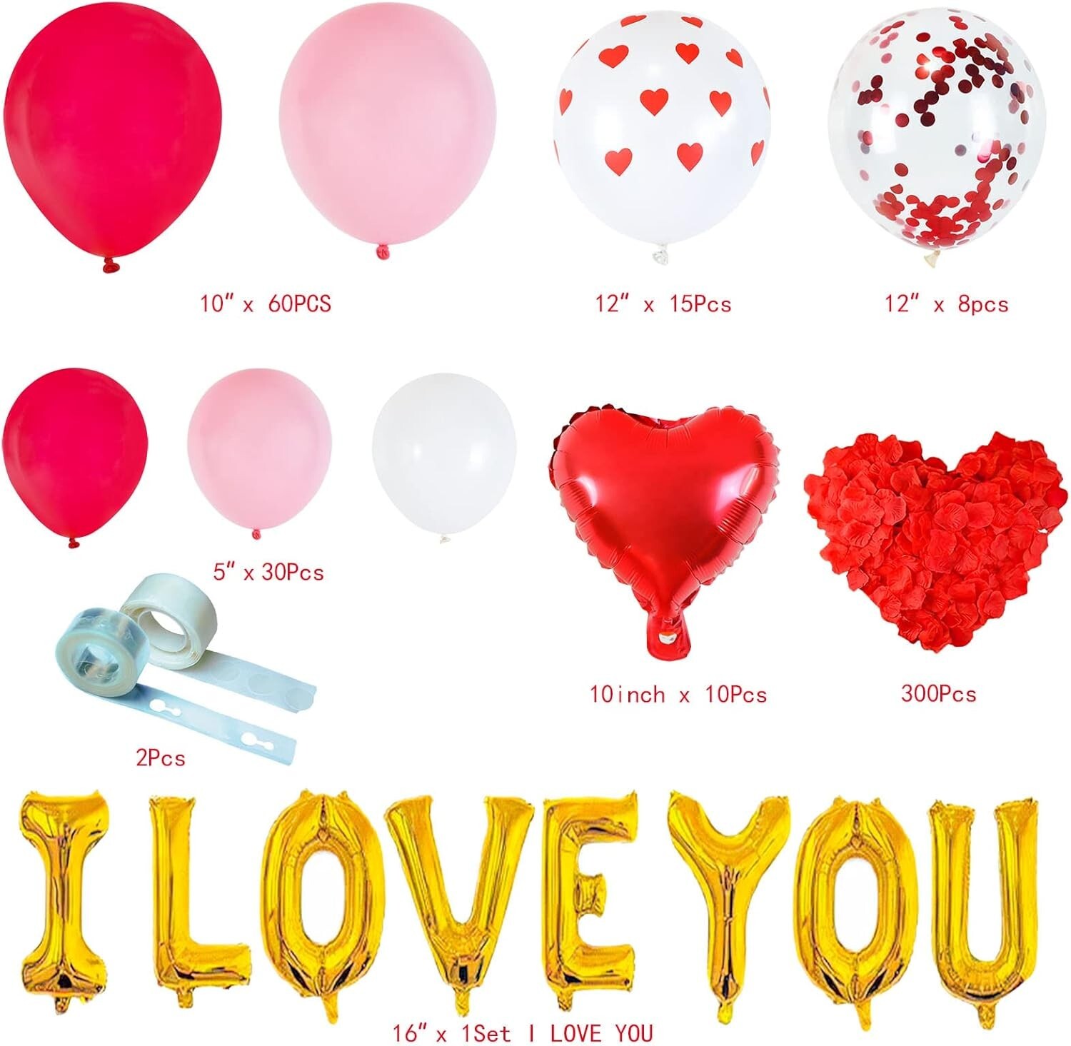 Valuable Valentine's Day Decorations -- Totally 129pcs items, including 60pcs 10 inch red pink latex balloons, 30pcs 5" red pink white latex balloons, 15pcs 12 inch red heart print balloons, 8pcs 12" red cofetti balloons, 10pcs 10" red heart foil balloons, 1 set 16" I LOVE YOU golden foil balloons, 300pcs silk rose petals, 1 roll 16ft balloon arch strip, 1 roll glue. Wonderful Valentines Decorations -- With our these nice bright color party decorations accessories, you can freely make various types of balloon arch garland to create wonderful romantic atmosphere and leave a deep impression on your lover. Great Valentine's Day Party Supplies -- Our sweet valentines balloon arch garland will be the perfect choice for you to decorate your home, bed room, hall, shopping mall, cafe, passageway, indoor or outdoor for Valentine's Day or Mother's Day, romantic party, proposal, galentines day decorations and more. No doubt is each one a great decoration. Easy to Assemble -- Making your own backdrop has never been easier! The balloon garland is surprisingly simple to build, no craft experience needed. Highly recommended filled balloons with air by electric air pump, it would save you lots of time to enjoy your sweet moment. Tips for You -- Please do not inflate latex balloons and foil balloons too full, 85% is fine. And at the same time, please inflate slowly to avoid over inflation.